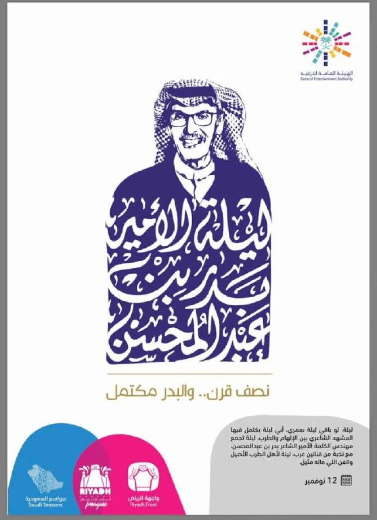 وتعد "ليلة البدر"، إحدى أهم الفعاليات التي ستقام ضمن موسم الرياض، احتفاءً بالأمير الشاعر بدر بن عبدالمحسن تحت شعار: "نصف قرن والبدر مكتمل"، وتأتي تقديراً لجهوده طوال العقود الماضية في إثراء الحركة الثقافية والفنية في السعودية والخليج عبر قصائده الملهمة، وسيشارك فيها نخبةٌ من الفنانين، منهم محمد عبده، وعبدالمجيد عبدالله، والدكتور عبدالرب إدريس، والفنانة الكويتية نوال، والفنان البحريني خالد الشيخ، إضافة إلى الفنان عبادي الجوهر، والسندباد راشد الماجد، وراشد الفارس، وأصيل أبو بكر. وينتظر عشاق البدر بشغف نقل هذه الليلة الفنية، ليستمتعوا بما تضمُّه من أحداثٍ ضخمة، نظراً لأن حضورها يقتصر على الدعوات الخاصة.