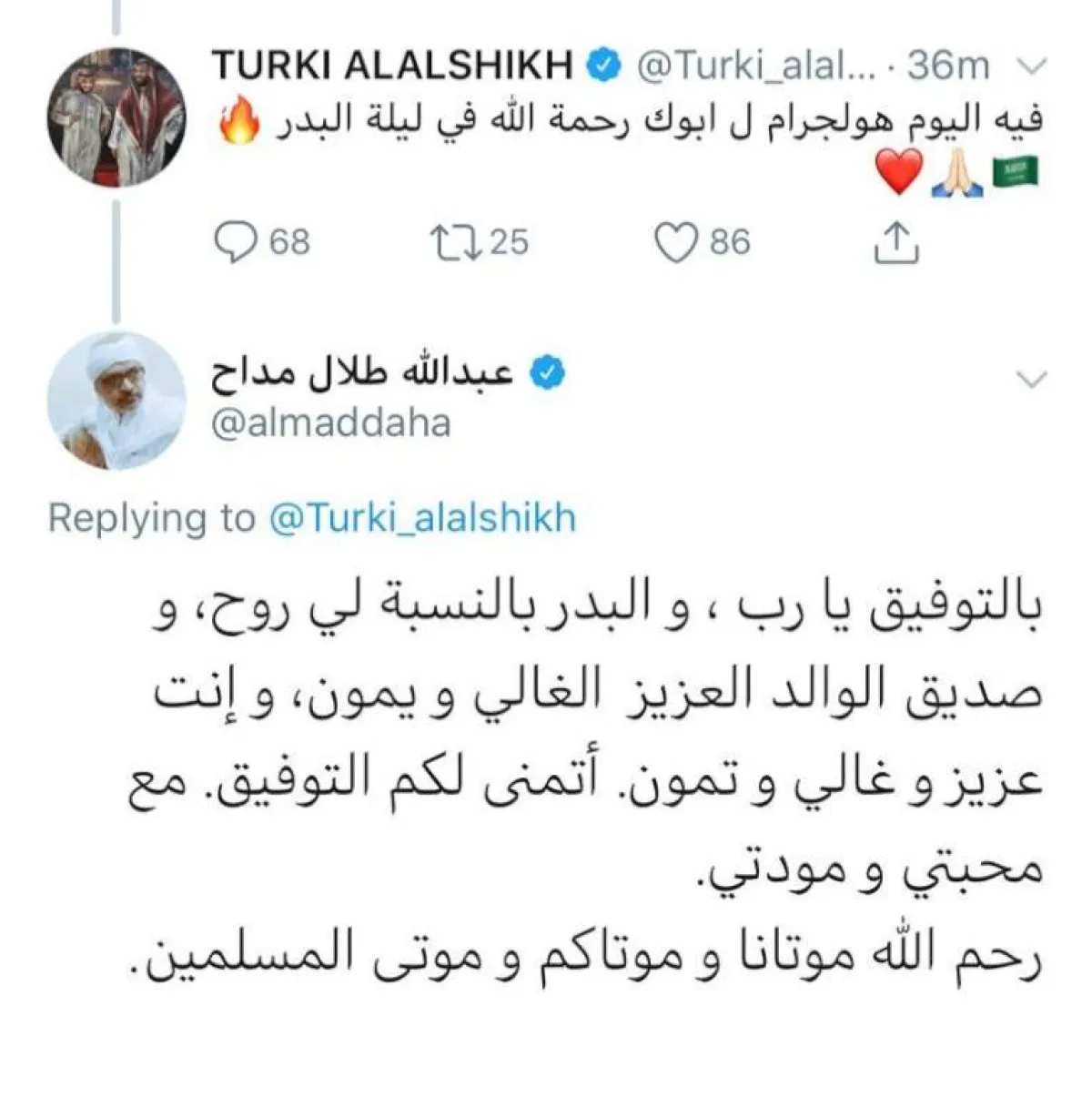 حيث قال آل الشيخ في تغريدة موجَّهةٍ إلى عبدالله ابن الفنان الراحل طلال مداح: "فيه اليوم هولوجرام لأبوك رحمه الله في ليلة البدر". فردَّ عليه عبدالله عبر تغريدة، قال فيها: "بالتوفيق يا رب، والبدر بالنسبة لي روح وصديق الوالد العزيز الغالي ويمون وانت عزيز وغالي وتمون. أتمنى لكم التوفيق مع محبتي ومودتي رحم الله موتانا وموتاكم وموتى المسلمين".