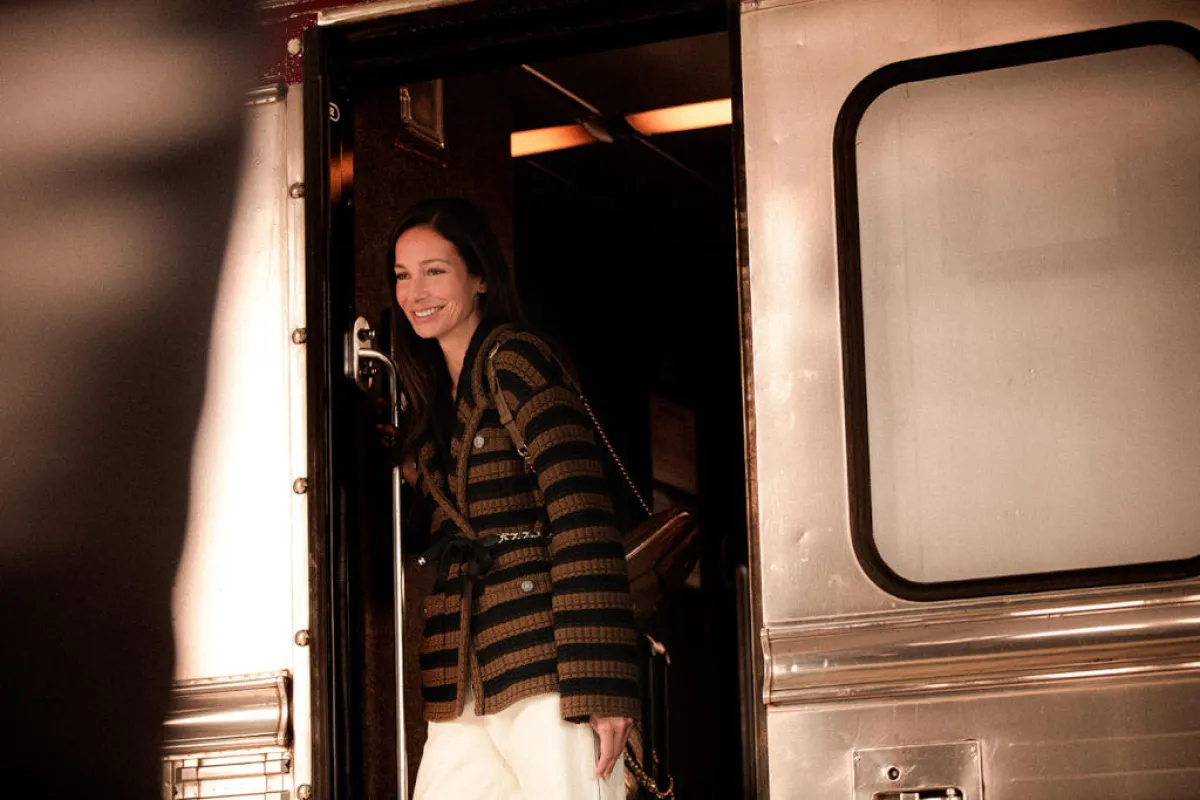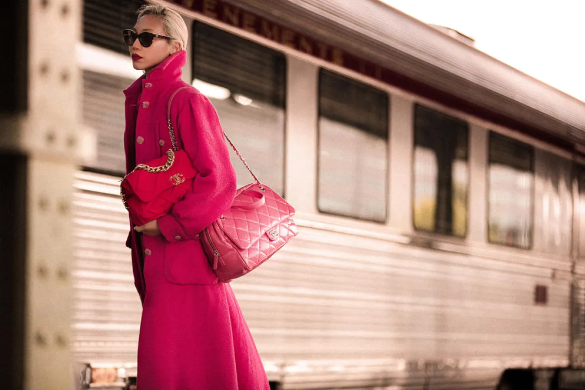 إلى جانب ألوان شانيل CHANEL الأيقونية مثل الأسود والبيج الفاتح والأبيض، تتباين درجات الوردي والأخضر والأزرق والفوشيا والبنفسجي والأزرق السماوي مع البني المائل إلى الأصفر الداكن والبني درجة الموكا والكحلي وأزرق الكوبالت. وتمتزج درجات الباستيل معًا، مكونة أوراقًا مطبوعة على خلفية من الأزرق أو الفوشيا المتطايرة في الهواء، لتشبه منظر طبيعي ضبابي بفعل سرعة القطار. ويصطف الترتر الوردي والأزرق ويتجمع مشكلاً فتحات تشبه ثقوب التذاكر. وتُكوّن تطرزيات الزهور، من الترتر أو المشكلة بالحرير والتول والرودويد، حديقة تتفتح في قلبها أزهار الكاميليا بكل فخامة.