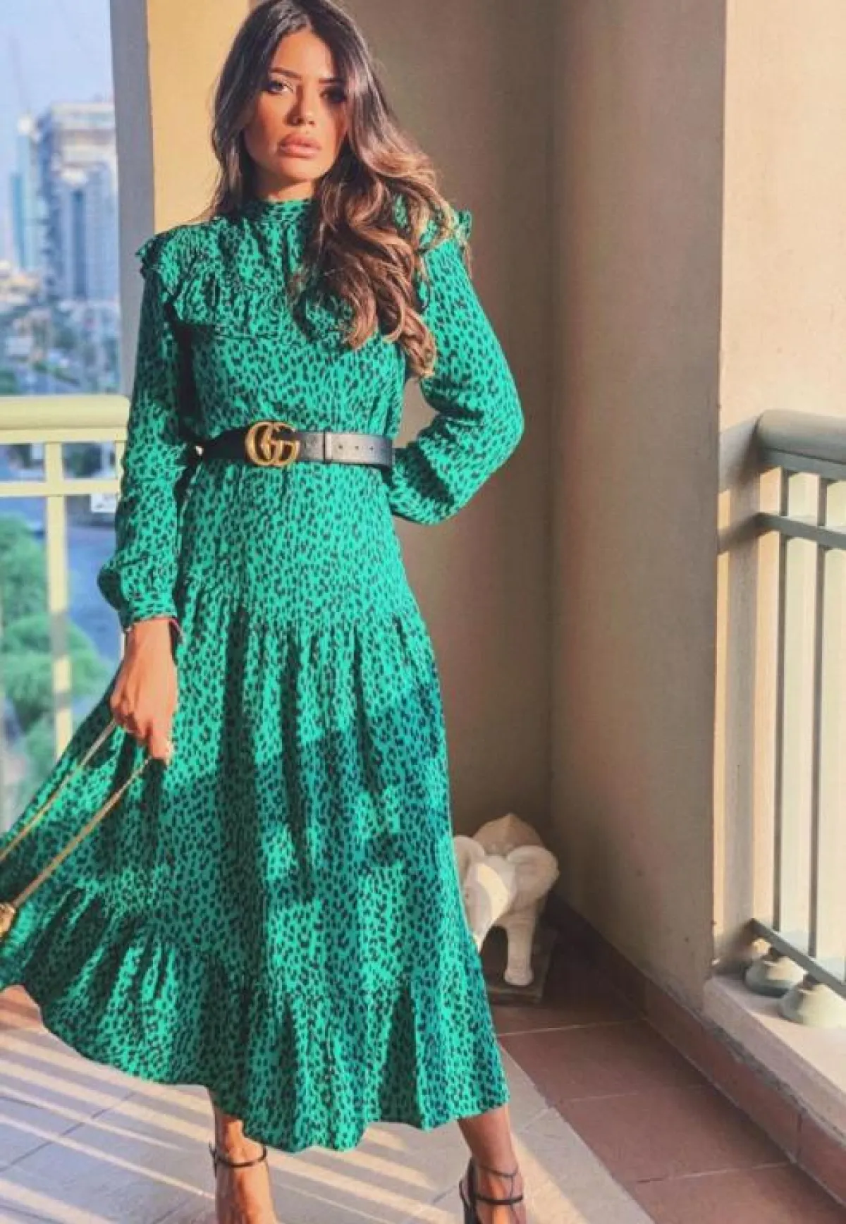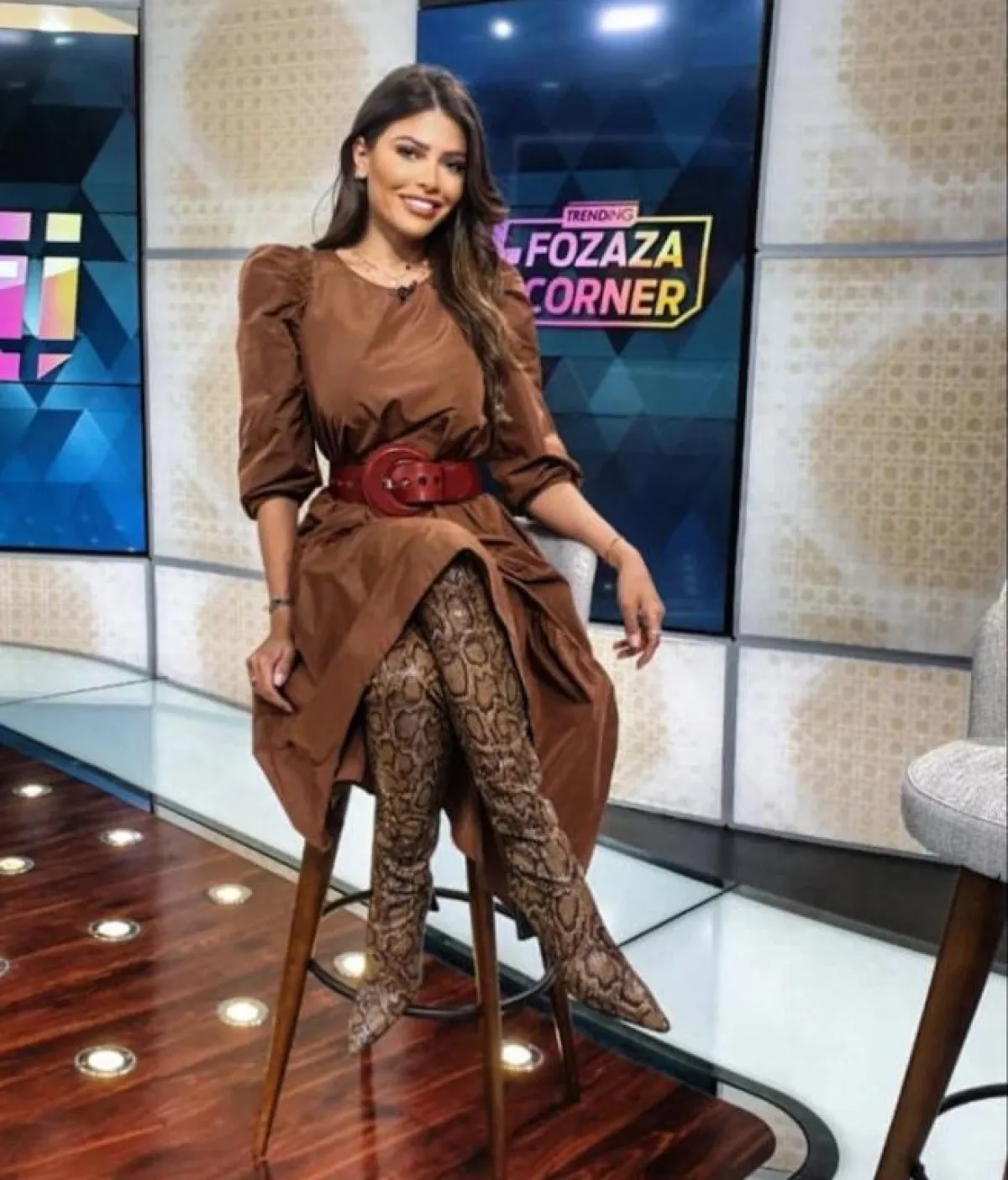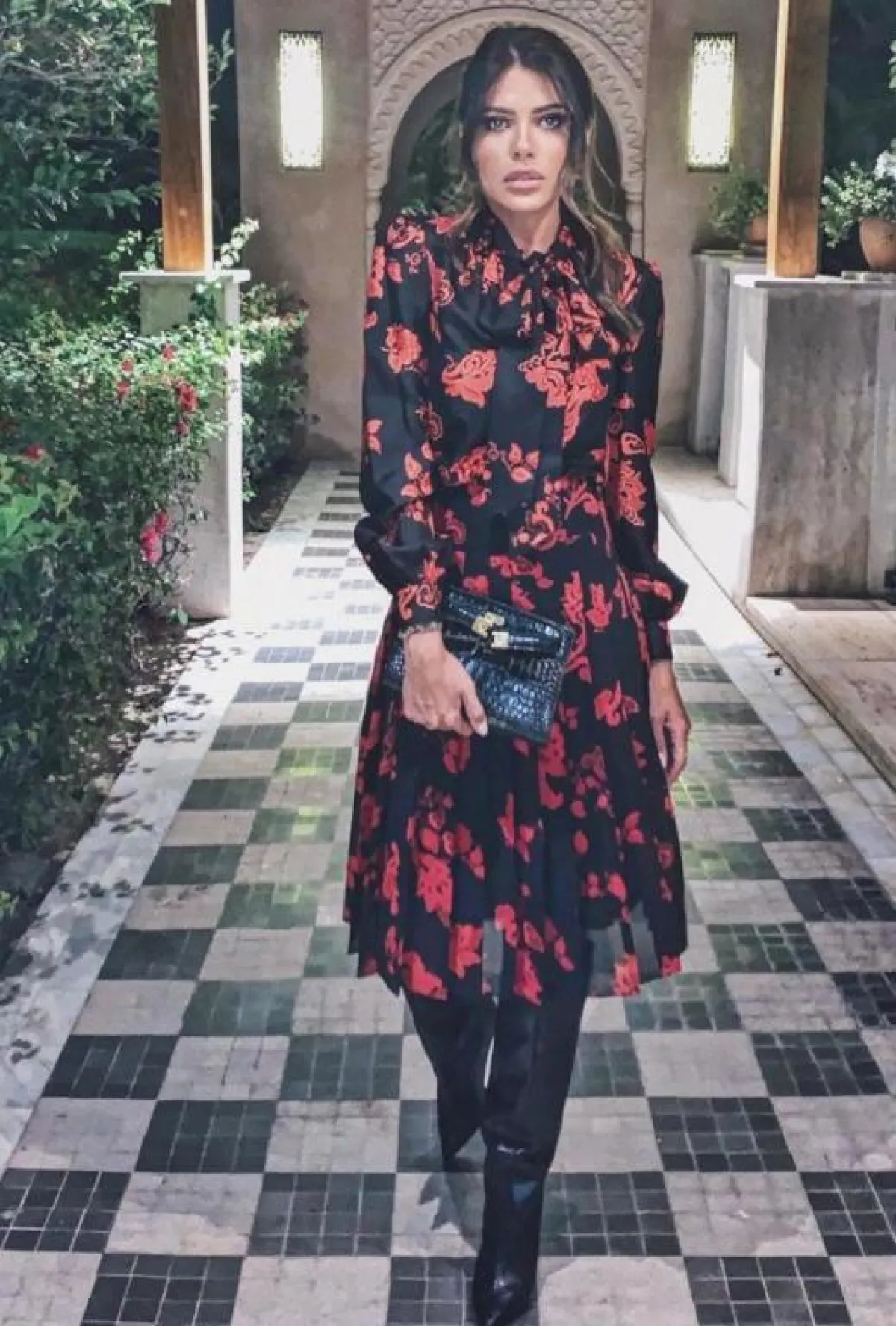 وتميزت بفستان أسود مزين بنقوش حمراء بطريقة مميزة مع بوت جلد أسود وحقيبة بنية، وتجملت بإطلالة مفعمة بالأنوثة بفستان بني بأكمام منفوخة مع حذاء بوت بني تكسوه النقوش، ولكسر لون إطلالتها ارتدت حزامًا أحمر عريضًا، واختارت لمظهر شبابي فستانًا من الجينز المزين بأزرار فضية، وأكملت ملحقاته من حقيبة وحذاء بوت باللون البني.