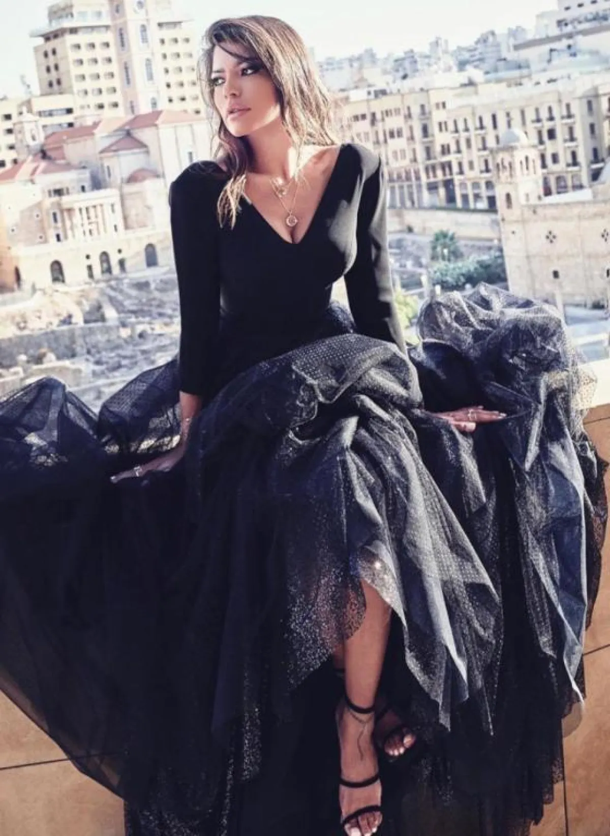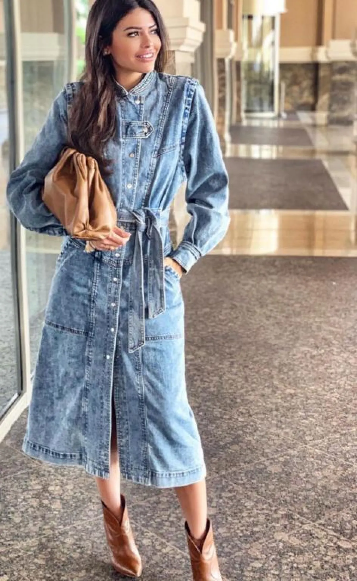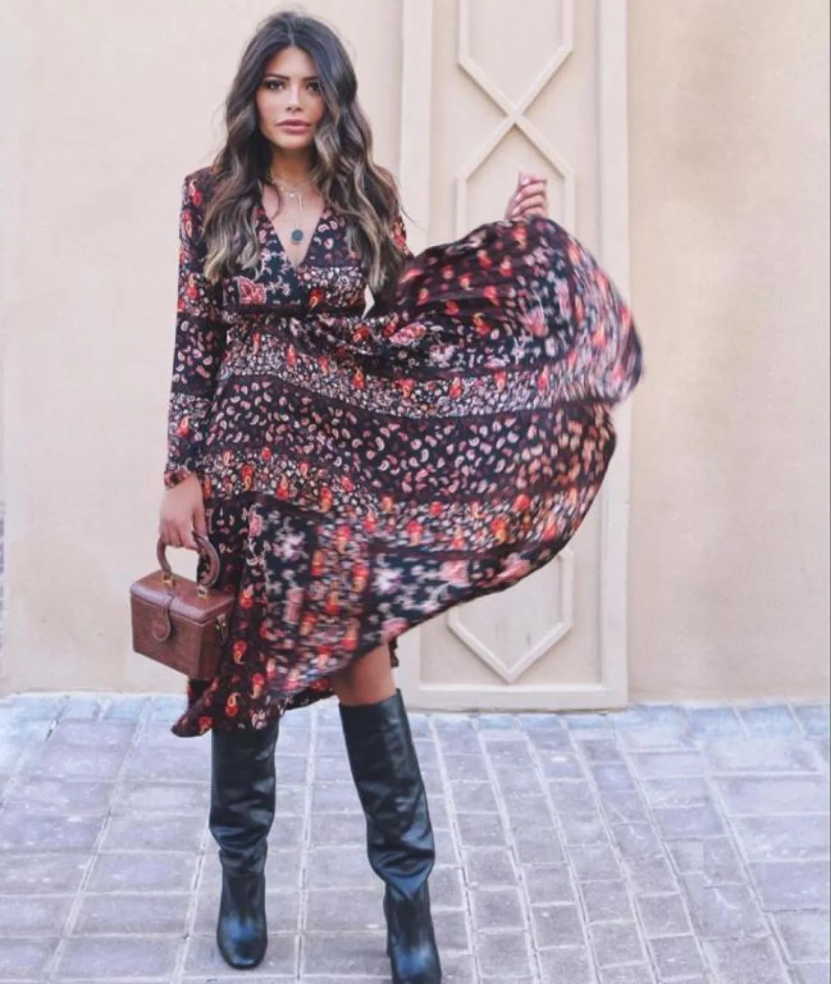 وتميزت بفستان أسود مزين بنقوش حمراء بطريقة مميزة مع بوت جلد أسود وحقيبة بنية، وتجملت بإطلالة مفعمة بالأنوثة بفستان بني بأكمام منفوخة مع حذاء بوت بني تكسوه النقوش، ولكسر لون إطلالتها ارتدت حزامًا أحمر عريضًا، واختارت لمظهر شبابي فستانًا من الجينز المزين بأزرار فضية، وأكملت ملحقاته من حقيبة وحذاء بوت باللون البني.