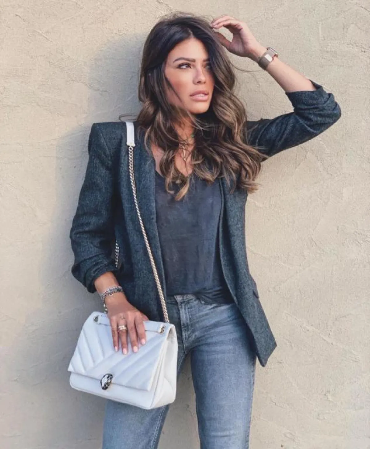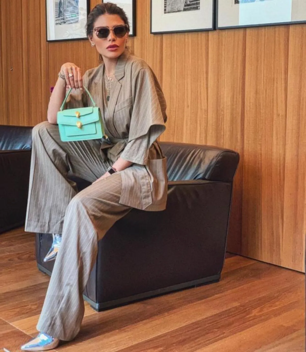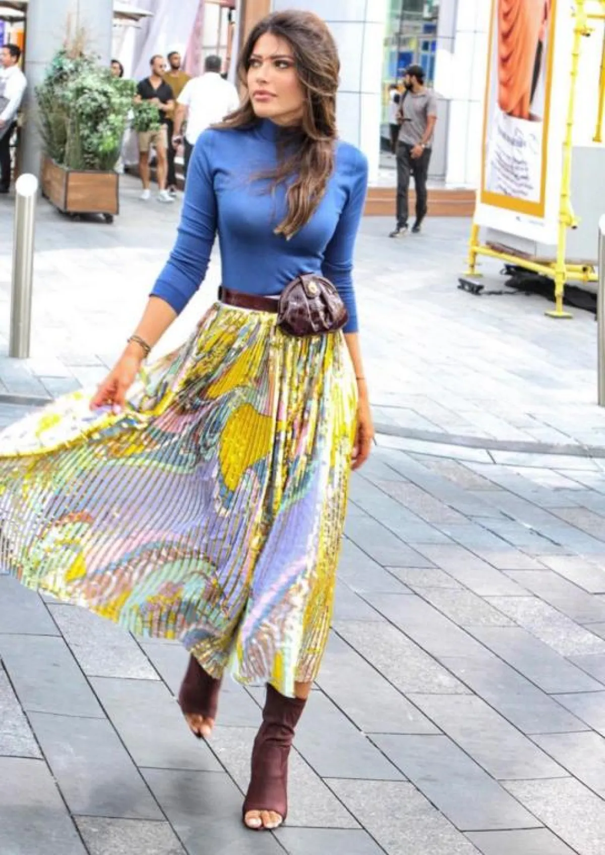 كما ارتدت بنطالًا رماديًا من الجينز وتيشيرتًا رماديًا مع بليزر رمادي لامع، وكسرت اللون بحقيبة بيضاء لخيار يومي، وظهرت بتنورة صفراء مزينة بنقوش ملونة مع بلوزة زرقاء، ولتكمل مظهرها المفعم بالألوان اختارت حقيبة بنية للخصر وحذاءً بكعب بني لمظهر عصري، ولإطلالة أنثوية عملية تزينت ببليزر وبنطال باللون البني وأكملت ملحقاتهما من الحقيبة والحذاء باللون البني المزين بتدرجات مختلفة من اللون البني أيضًا.