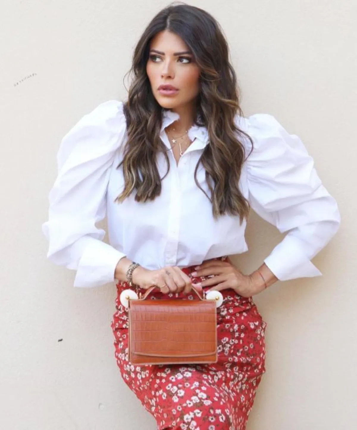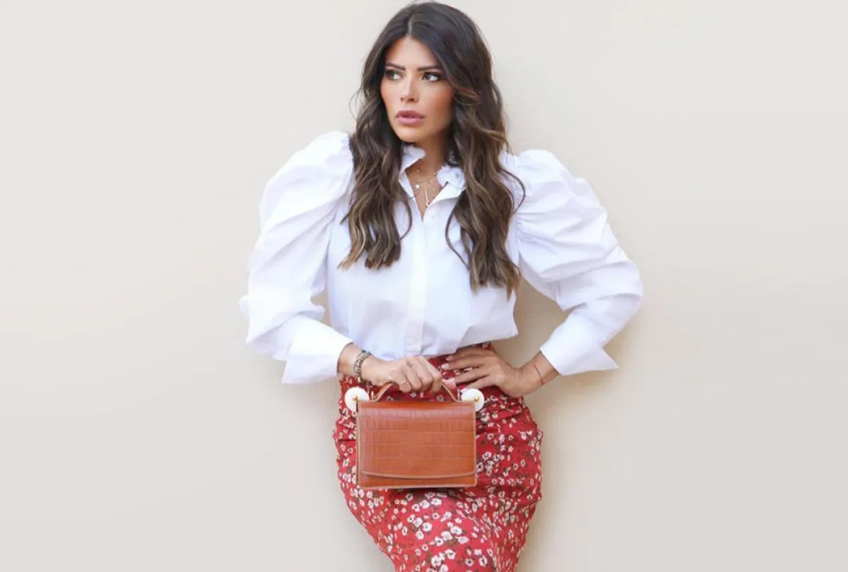 وفي مظهر يجمع بين اللوك العملي والعصري تألقت بتنورة حمراء مزينة بزهور بيضاء وقميص أبيض مصمم بأكمام منفوخة، ولمظهر يومي مميز أطلت ببنطال وجاكيت باللون الزيتي المزين بخطوط، وكسرت لون إطلالتها بحقيبة تيفانية وإكسسوارات ذهبية مع حذاء فضي.