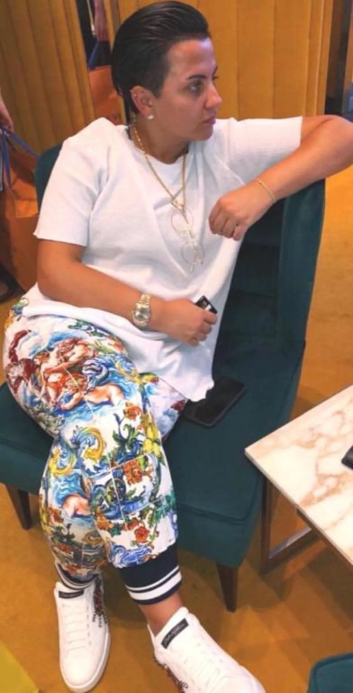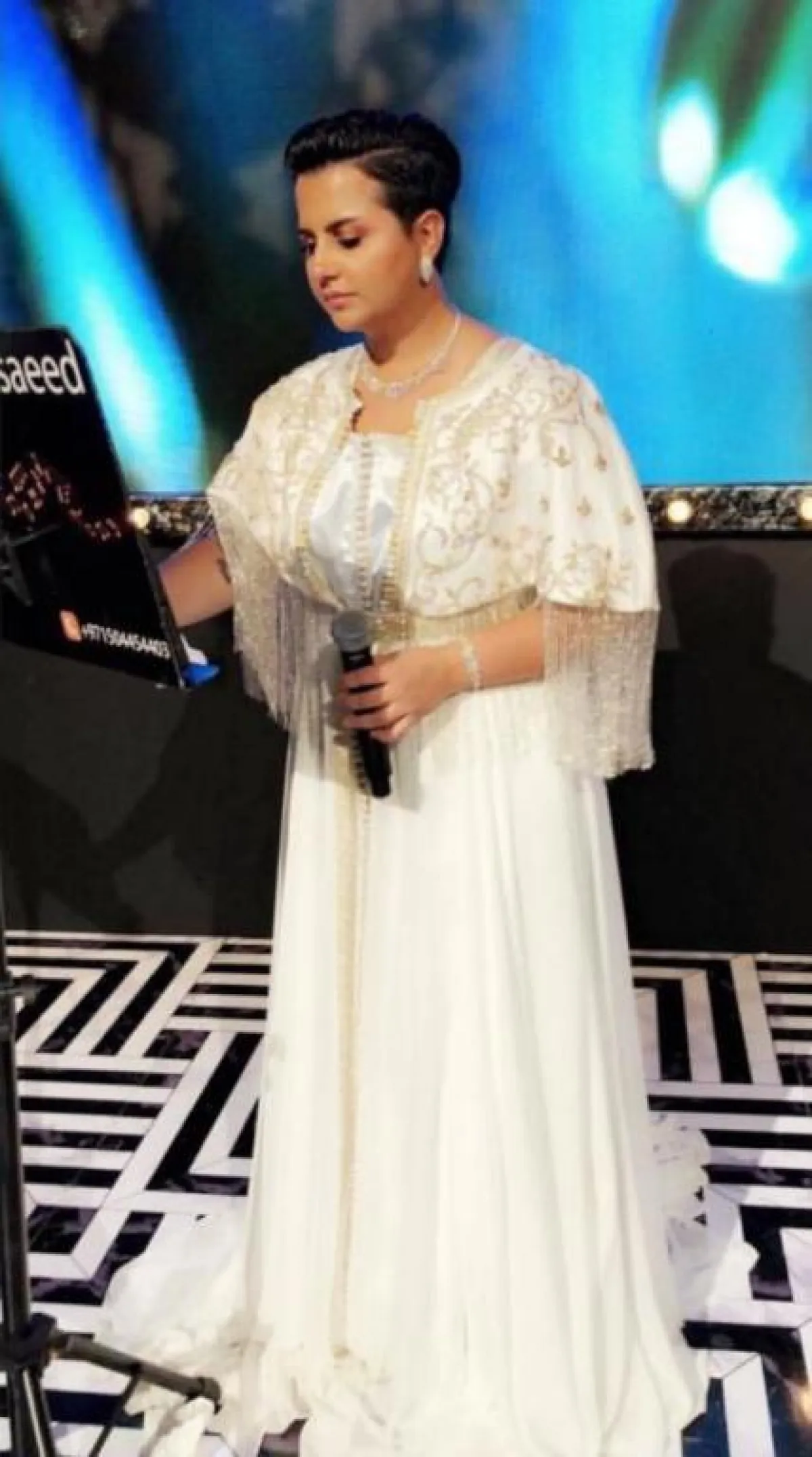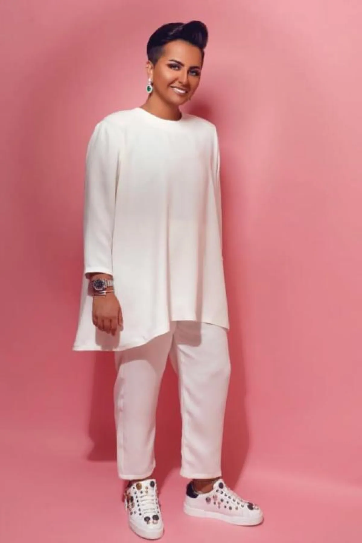 ولمظهر بسيط اختارت قميصًا أبيضَ مزينًا بخطوط، وأكملته ببنطال من القماش ذاته، وتأنقت بقفطان أبيض مزين من الجزء العلوي بنقوشات ذهبية، وتزينت ببلوزة بيضاء طويلة مع بنطال فضفاض أبيض وحذاء رياضي أبيض مزين بفصوص.