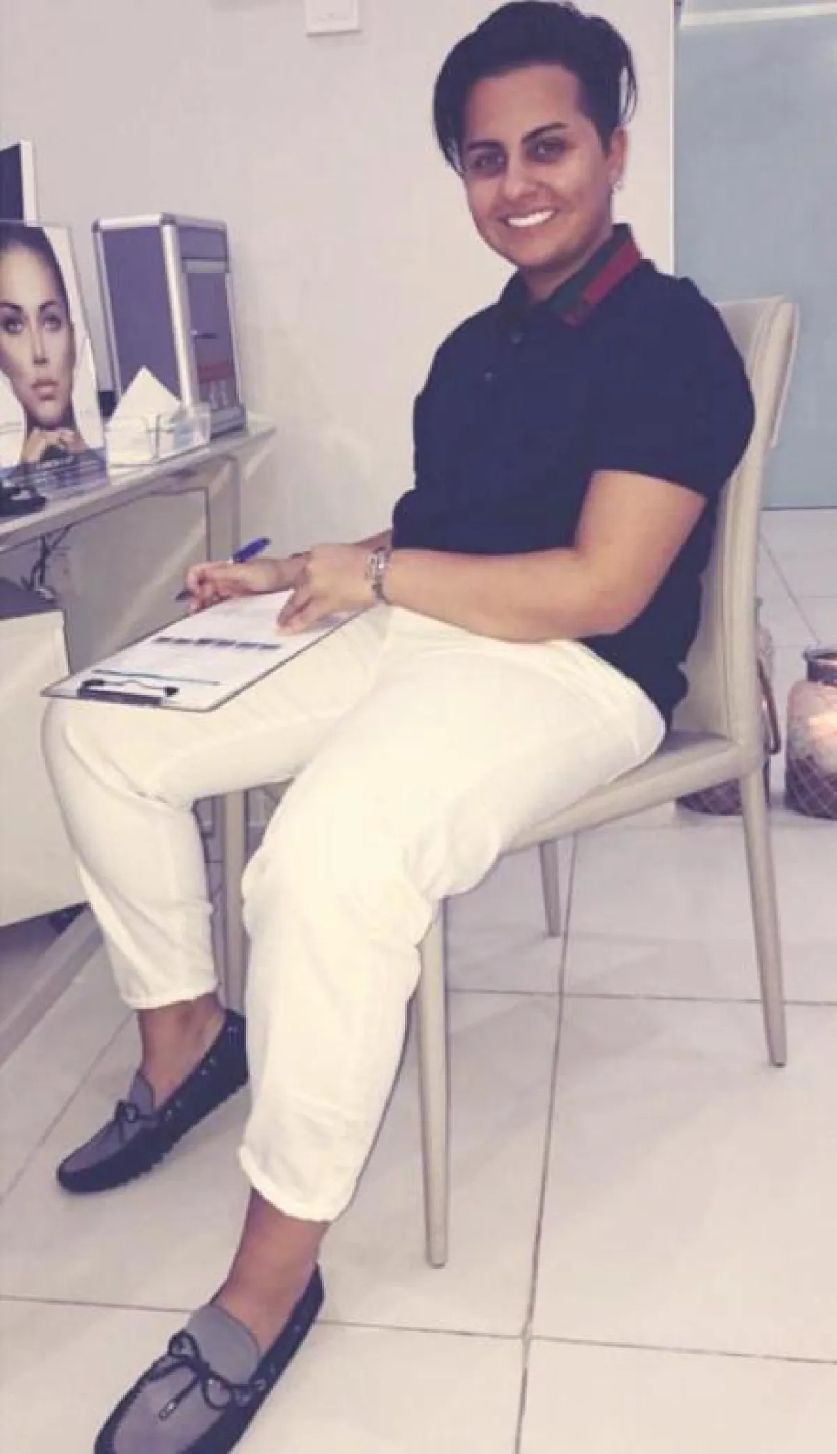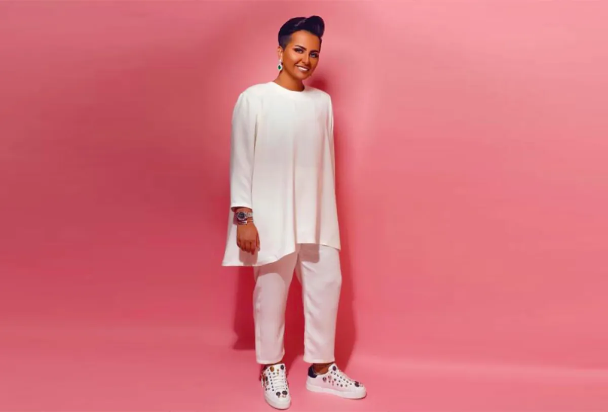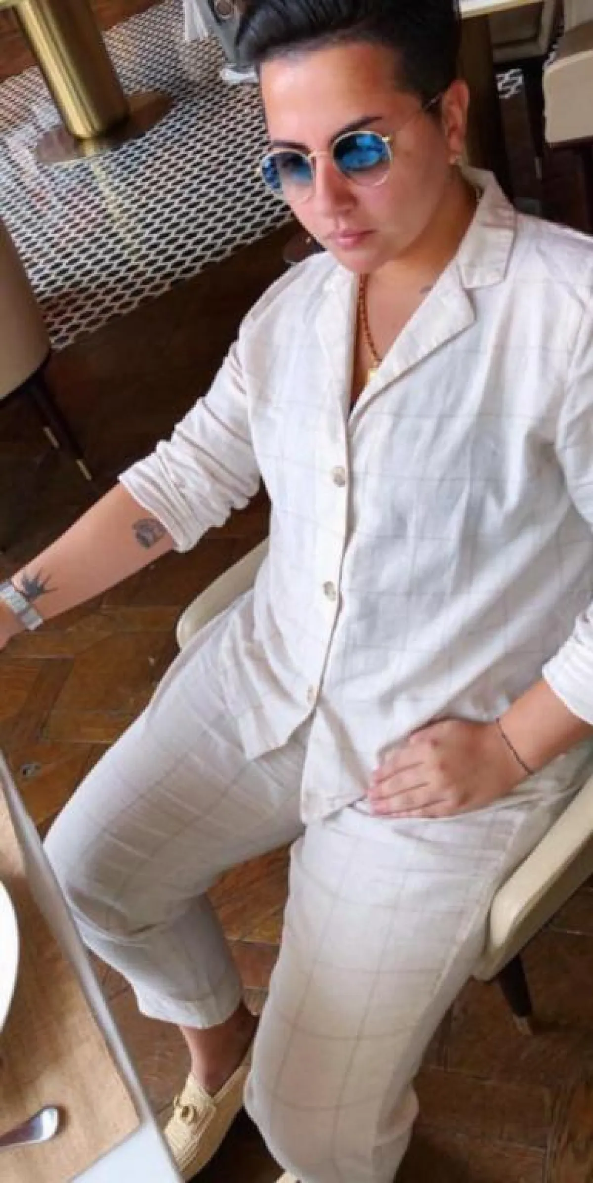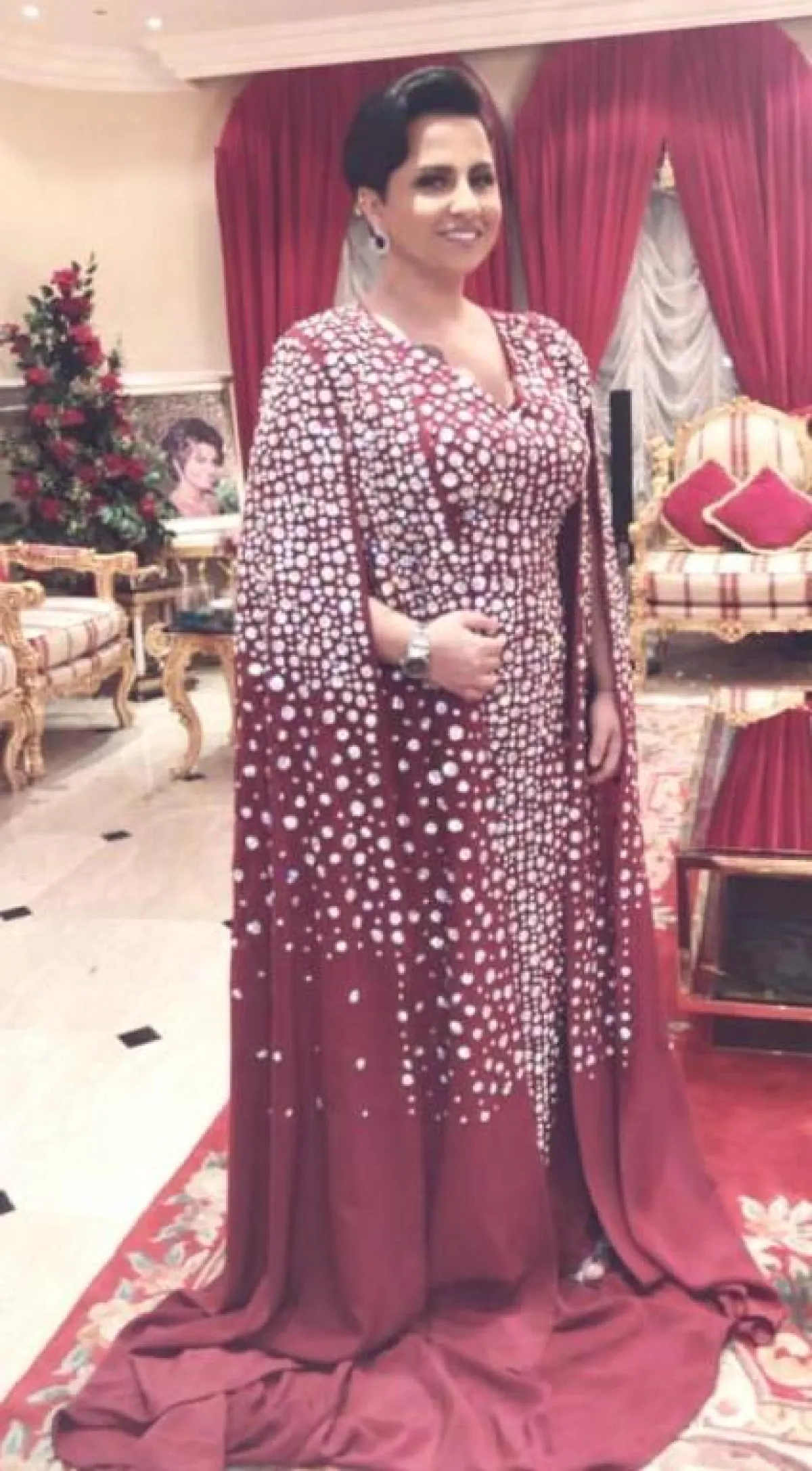 ولمظهر بسيط اختارت قميصًا أبيضَ مزينًا بخطوط، وأكملته ببنطال من القماش ذاته، وتأنقت بقفطان أبيض مزين من الجزء العلوي بنقوشات ذهبية، وتزينت ببلوزة بيضاء طويلة مع بنطال فضفاض أبيض وحذاء رياضي أبيض مزين بفصوص.