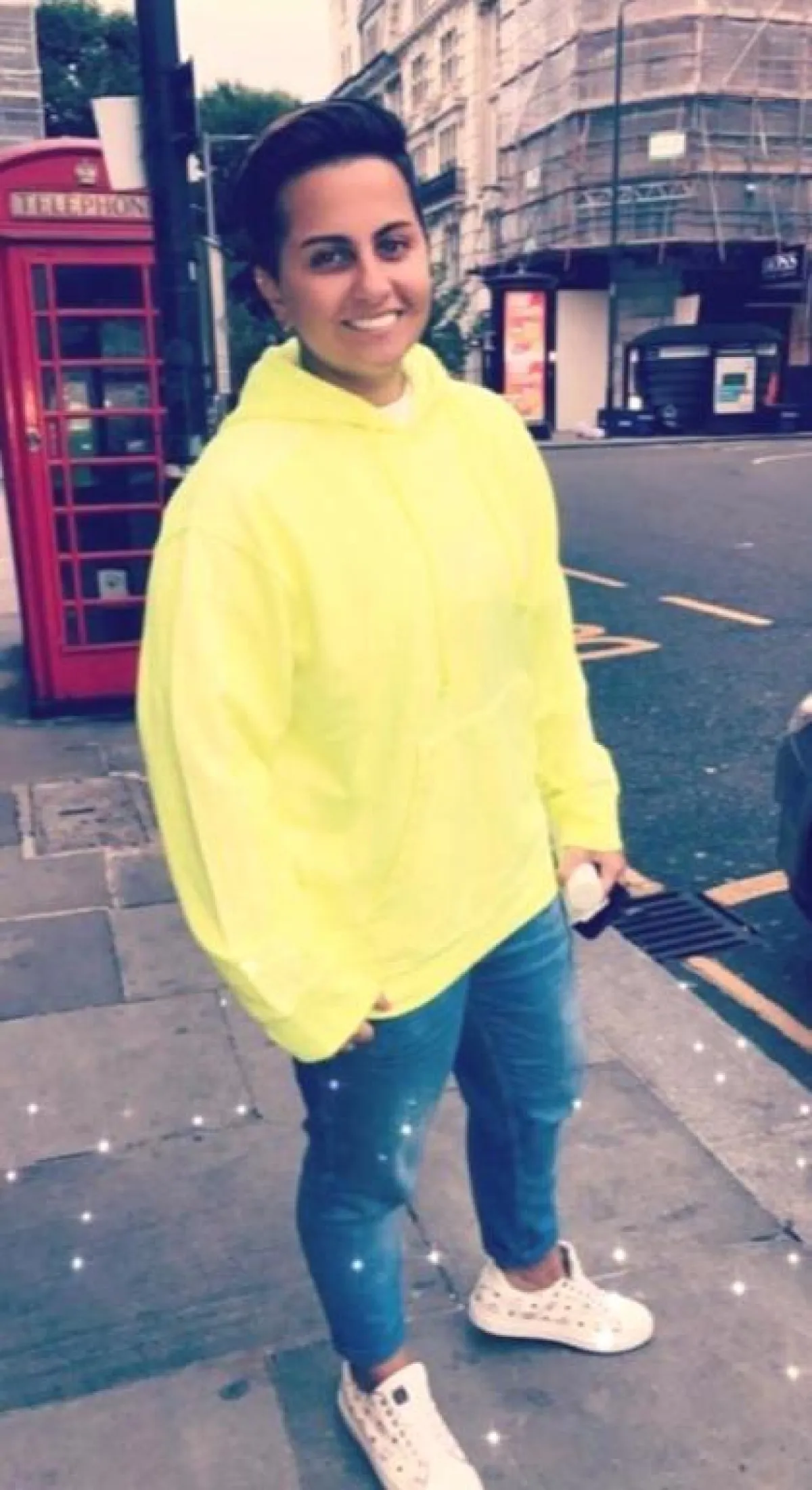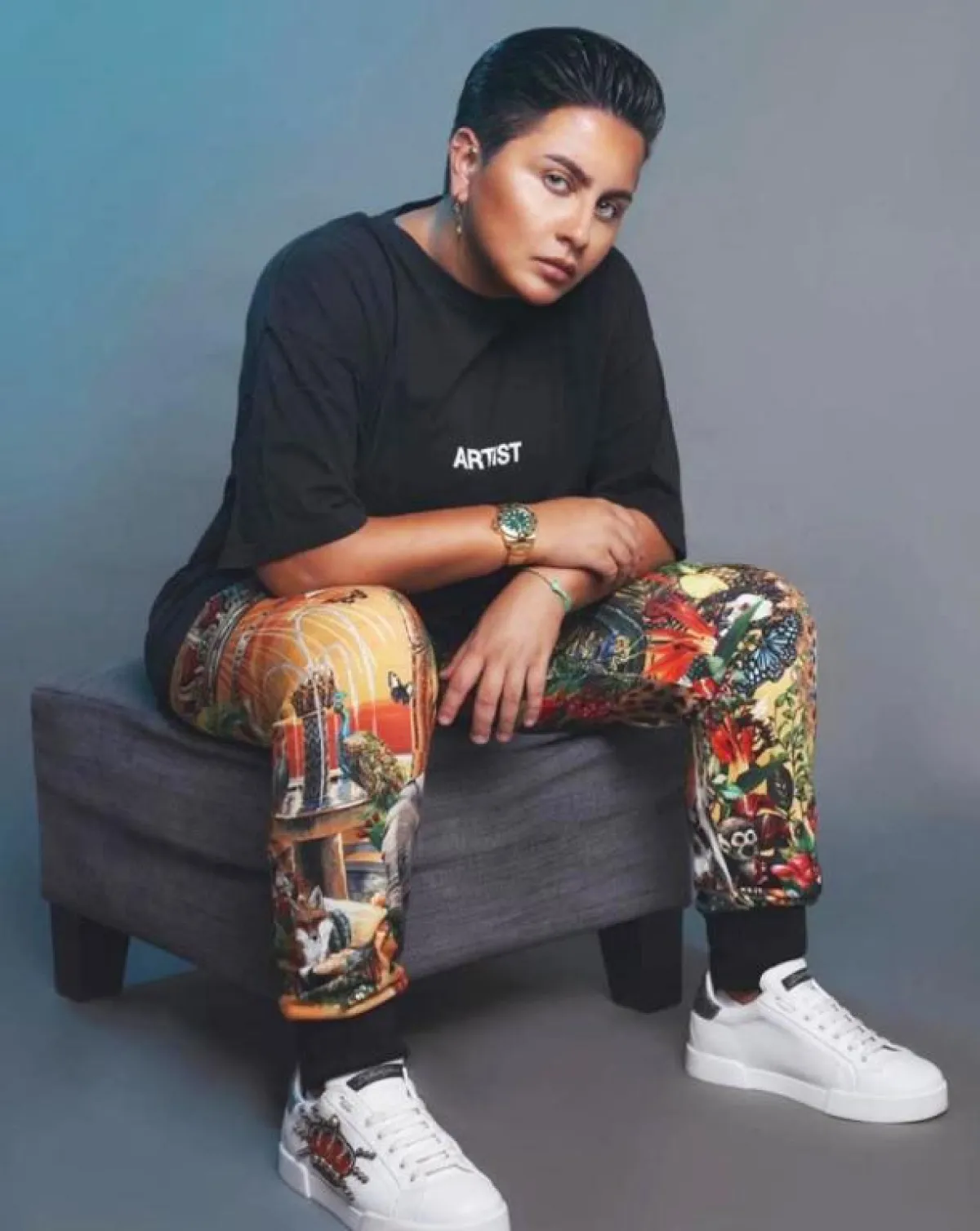 نسقت شما بنطالاً مليئًا بالنقوش الملونة مع تيشيرت أسود بكتابة بيضاء وحذاء رياضي أبيض، وأطلت ببنطال أبيض مزين بنقوش وتيشيرت أبيض، وتجملت ببنطال أسود وبلوزة سوداء بفصوص كريستالية وحذاء رياضي أسود.