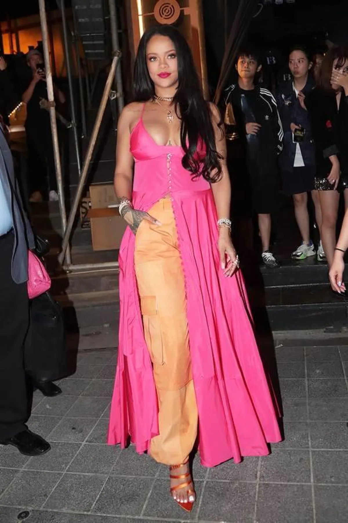 كعادتها، تميل المغنية العالمية ريهانا إلى الصيحات العصرية الجريئة، لذلك اعتمدت البنطلون بصيحة الكارغو المزود بجيوب كبيرة الحجم. لم تكتفي ريهانا بتصميم الكارغو اللافت، بينما زادت إطلالتها جاذبية باعتماد البنطلون البرتقالي مع قطعة أخرى باللون الزهري.