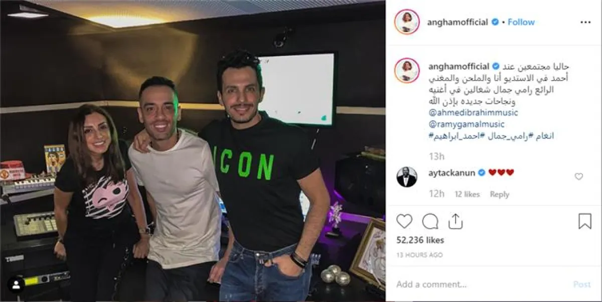 صرح الموزع الموسيقى أحمد إبراهيم أن الجلسة التي جمعت بين المطربة أنغام والملحن رامي جمال داخل الاستديو الخاص به أمس، هي جلسة عمل على أغنيتين جديدتين ستقوم أنغام بضمهما لألبومها المقبل.