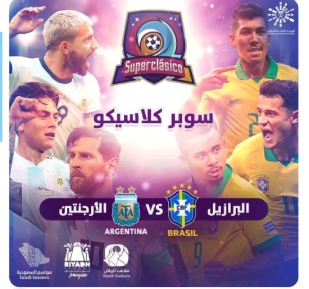 طُرحت للبيع تذاكر مباراة «سوبر كلاسيكو»، التي تجمع قطبَي القارة الأمريكية الجنوبية البرازيل والأرجنتين على ملعب الملك سعود في الرياض «محيط الرعب»، الجمعة 15 نوفمبر الجاري، وتُجرى ضمن فعاليات موسم الرياض التي تُنظَّم تحت رعاية هيئة الترفيه.