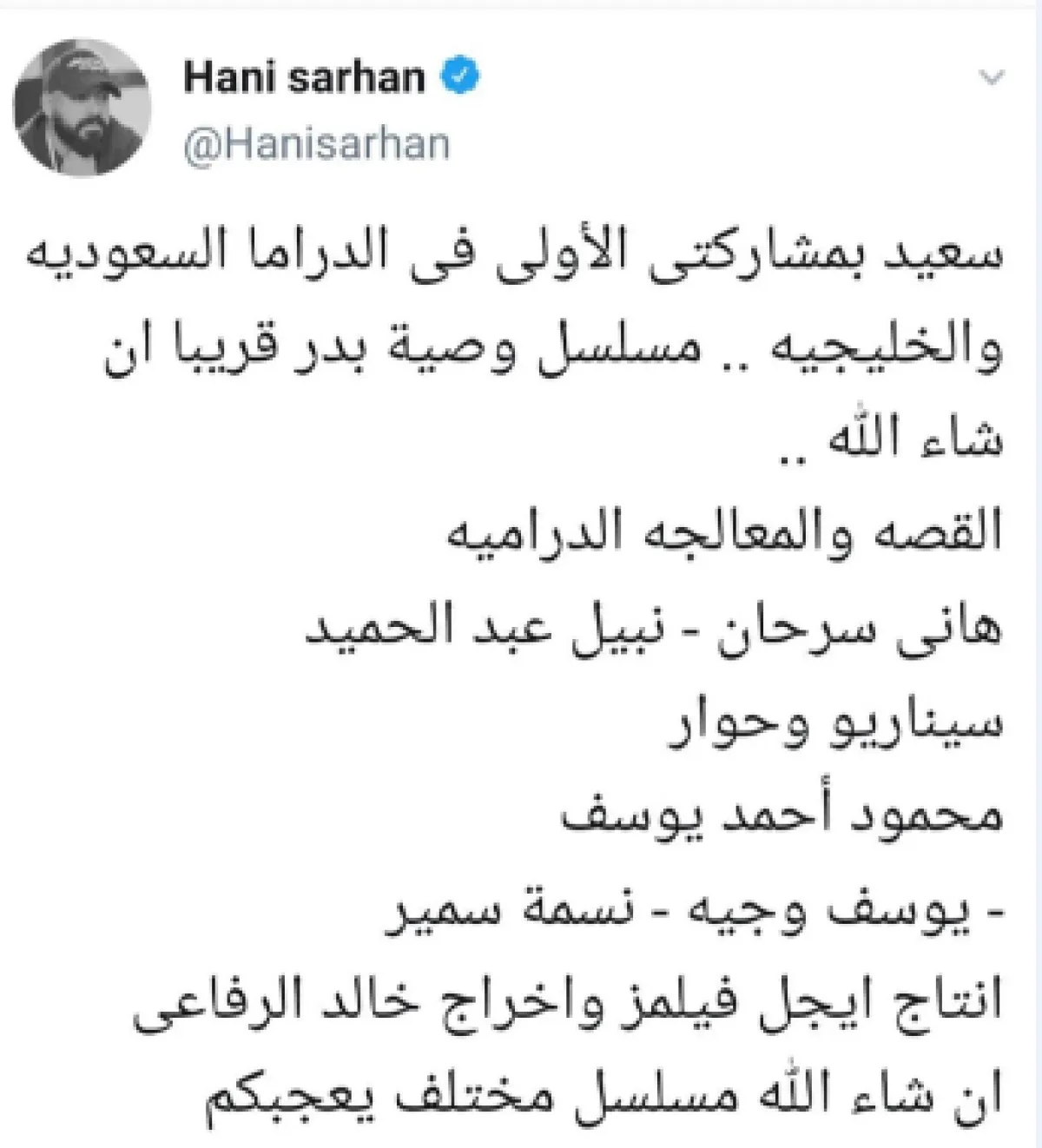 أعرب السيناريست هاني سرحان عن سعادته بأولى تجاربه الدرامية في الدراما السعودية من خلال مسلسل "وصية بدر" التي تدور أحداثه في إطار اجتماعي حول علاقة الآباء بالأبناء، كما يناقش مشكلة الأشخاص الذين يقومون بالحكم على الآخر من دون سابق معرفة به.