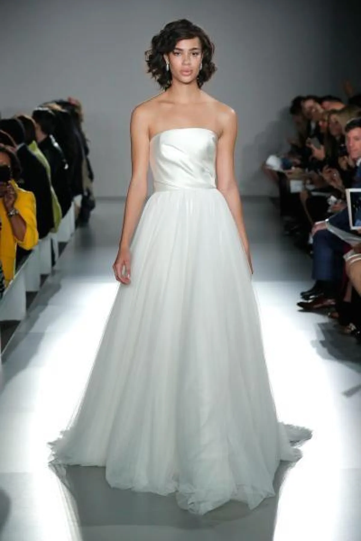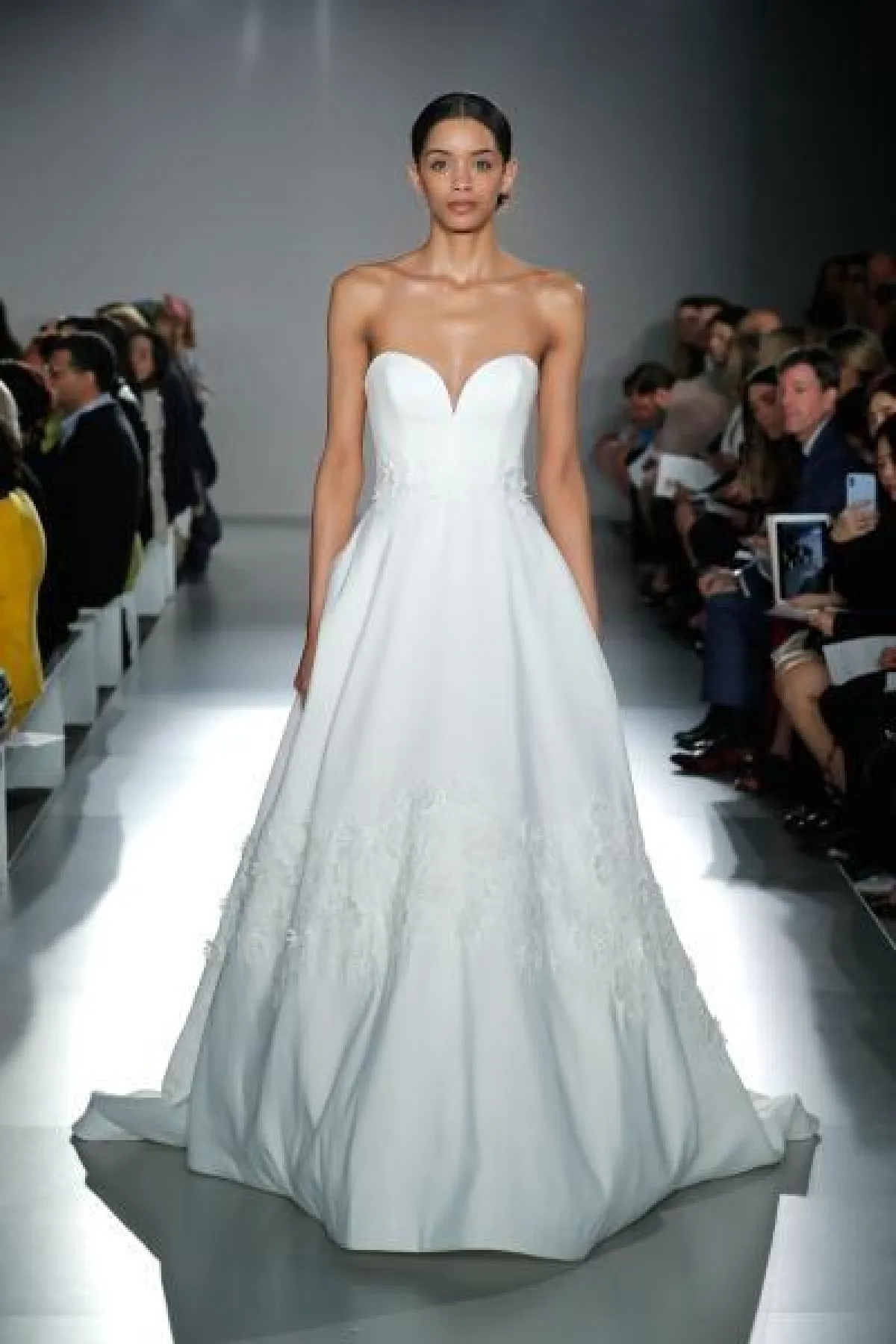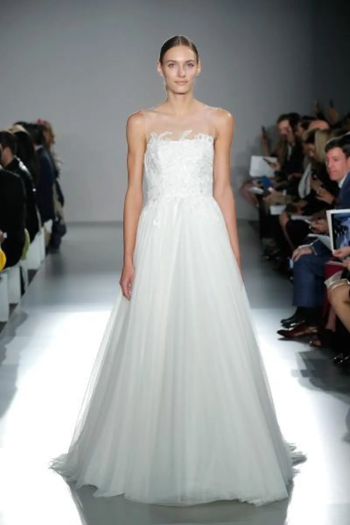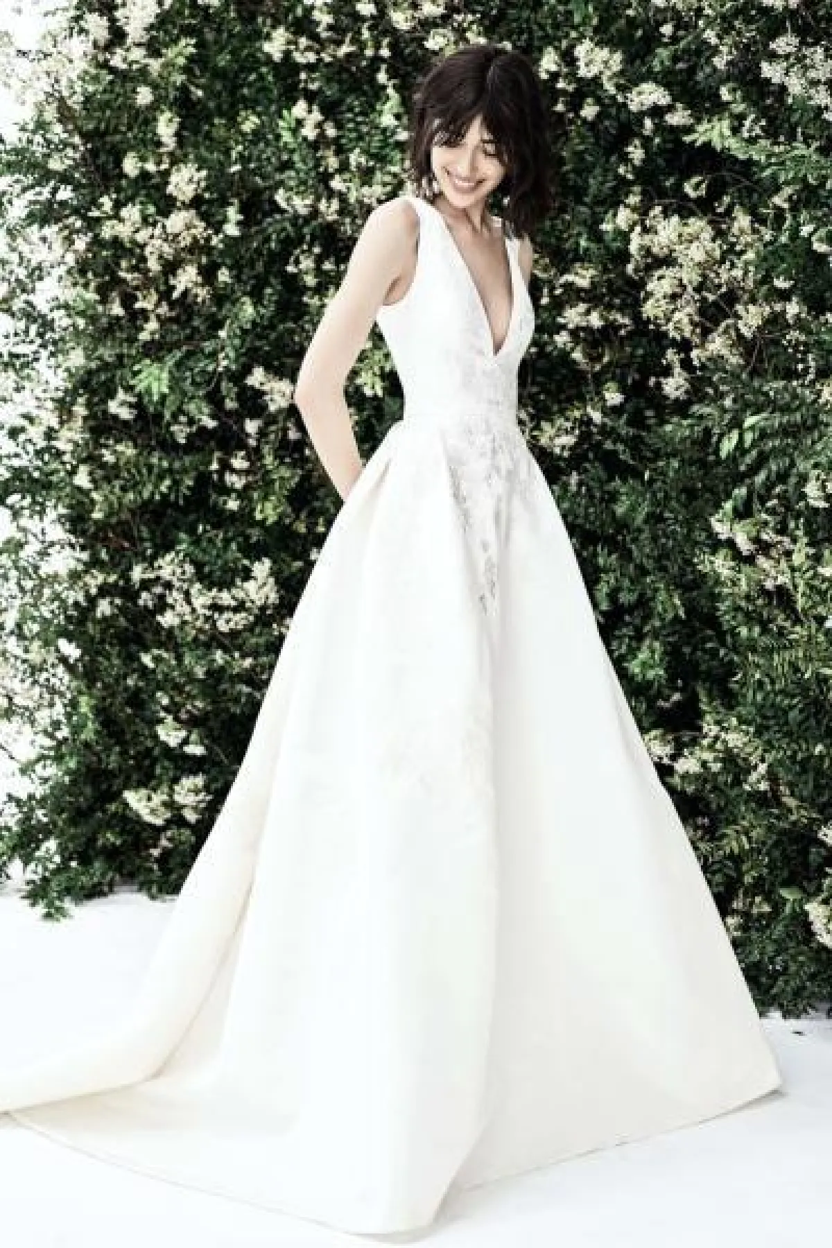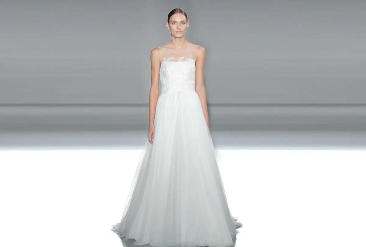 قدمت ماركة Amsale فساتين فرح ناعمة بقصّة ديكولتيه، مع تنورة منفوشة، وبدت التصاميم كلاسيكية راقية وخالية من التفاصيل البارزة والتطريزات البرّاقة.