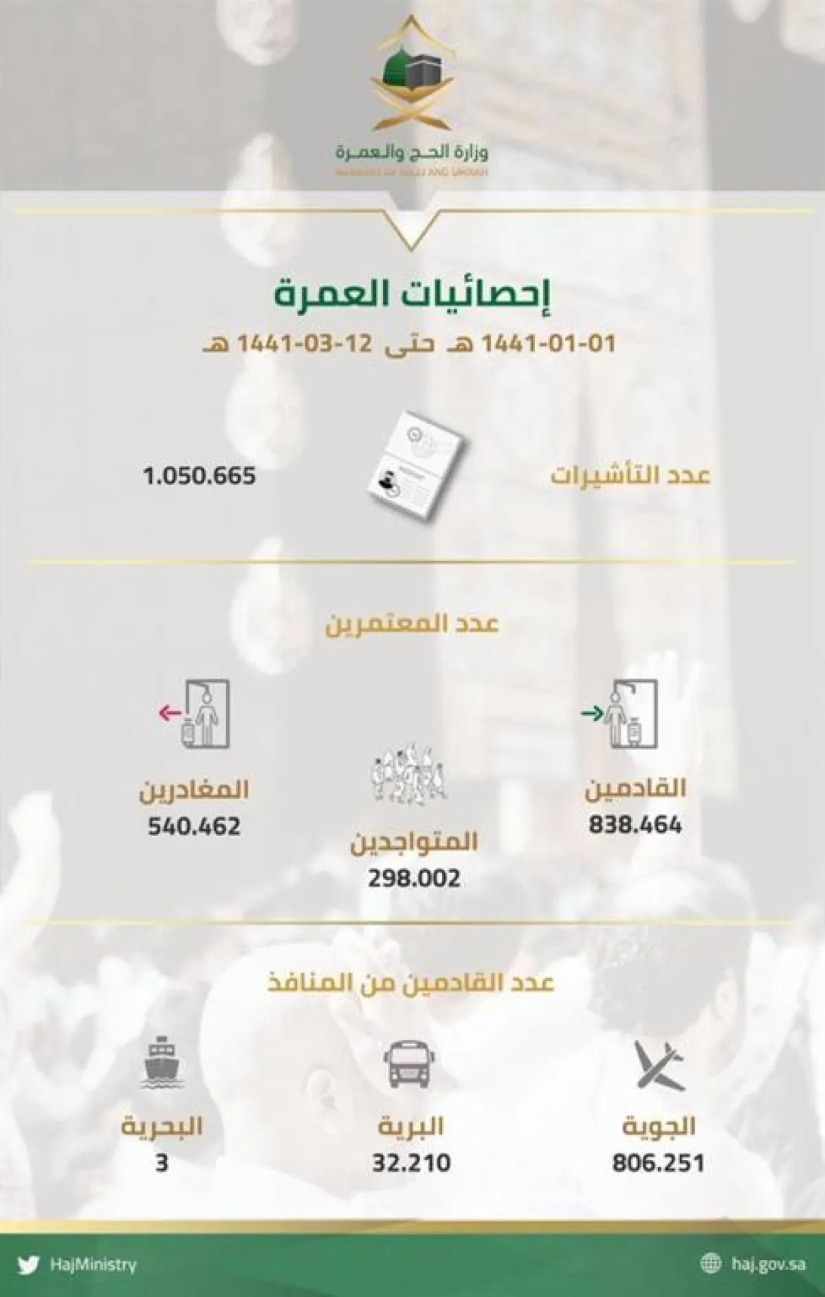 كشفت وزارة الحج والعمرة عن إصدار أكثر من مليون تأشيرة عمرة، وقدوم أكثر من 800 ألف معتمر إلى المملكة، وذلك حتى نهاية يوم 12 ربيع الأول 1440 هـ.