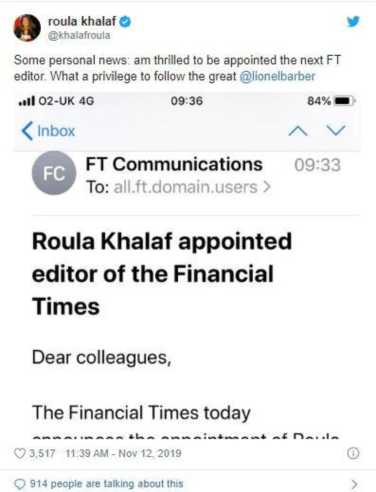 وقالت رولا إنه لشرف كبير تعييني رئيسة لتحرير «فايننشال تايمز» أعرق مؤسسة صحفية في العالم.