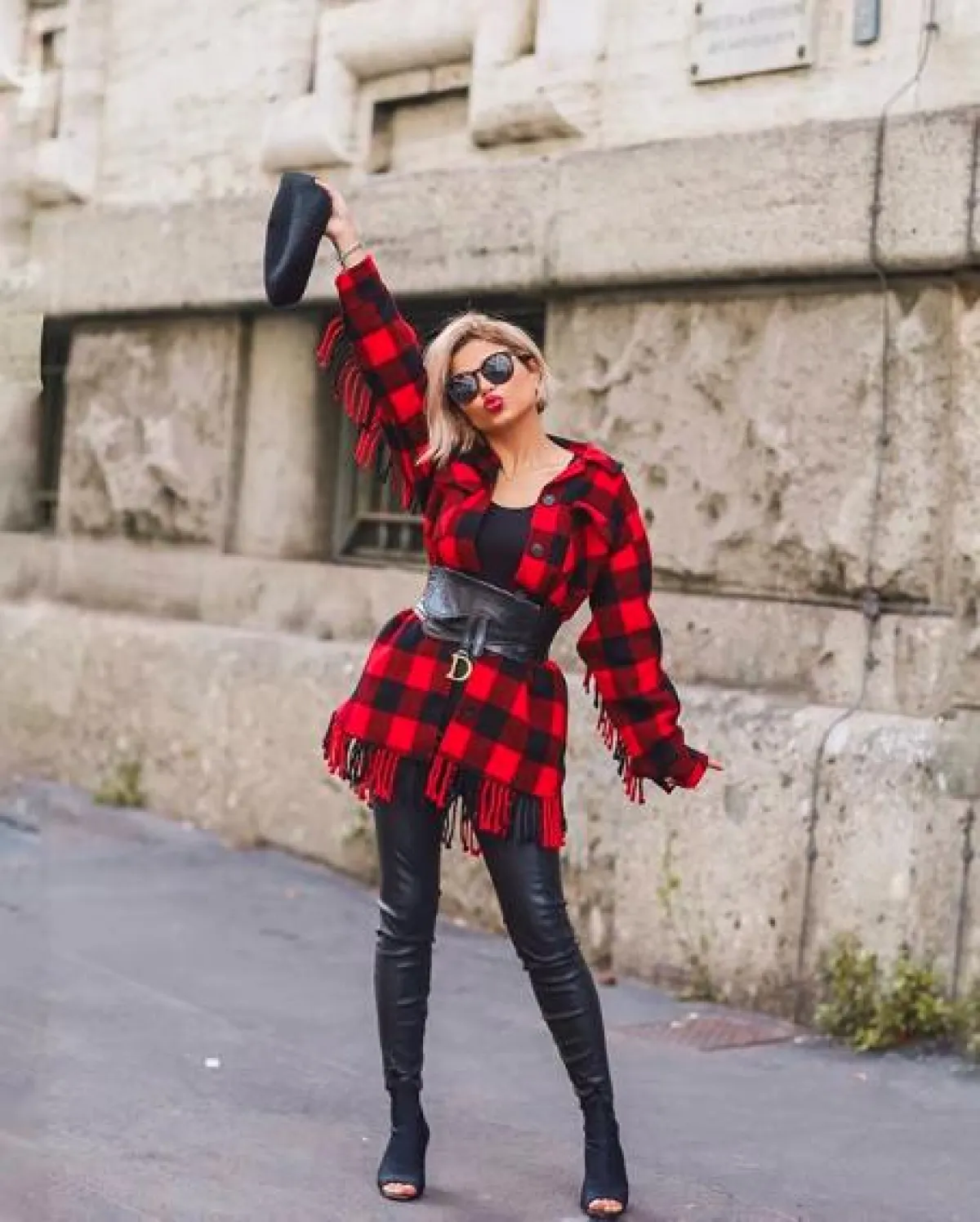 السروال الضيق المصنوع من الجلد يُعتبر من الصيحات الكلاسيكية التي لا تخرج من الموضة، وهنا نسقته نهى نبيل بأسلوب شبابي، حيث إنها اختارت معه قميصًا بقصة واسعة ونقشة الكارو باللونين الأسود والأحمر من ديور Dior، مع حزام عريض من الجلد الأسود على الخصر، وأكملت الاطلالة بحذاء كاحل أسود وقبعة “بيريه” ونظارات شمسية.