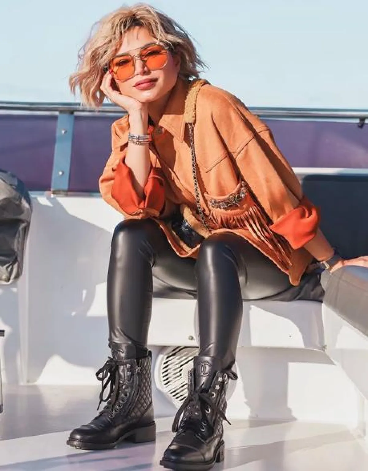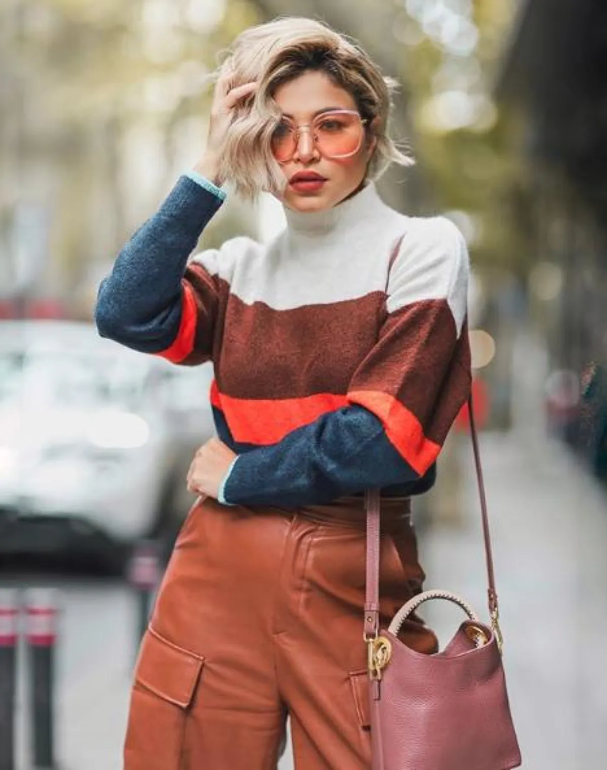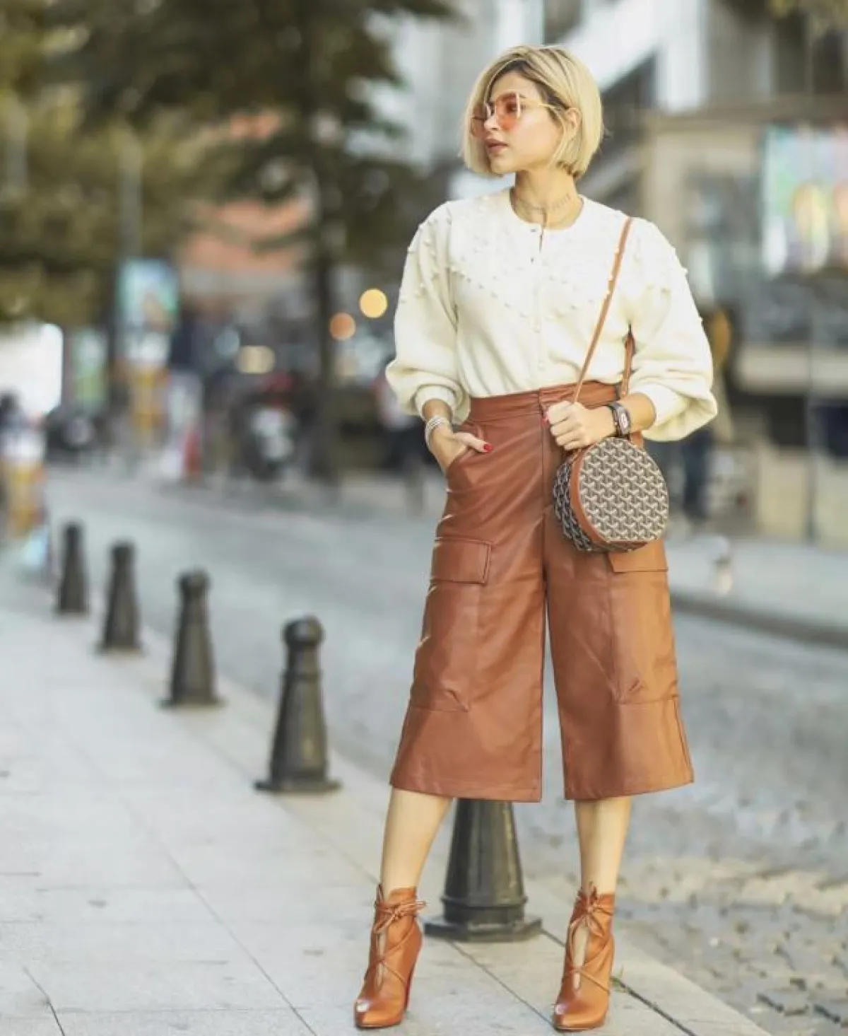 شاهدنا نهى نبيل في اطلالة صباحية ذات طابع خريفي مؤخرًا، اعتمدت فيها على البرمودا أو الشورت الطويل بقصة أرجل واسعة وخصر عالٍ مصنوع من الجلد باللون العسلي، والبرمودا رائج جدًّا هذا الموسم، وقد نسقت معه كارديغان بتصميم ناعم باللون الأبيض السكري، وأكملت اللوك بحقيبة كتف مميزة وحذاء كاحل من لون الشورت نفسه.
