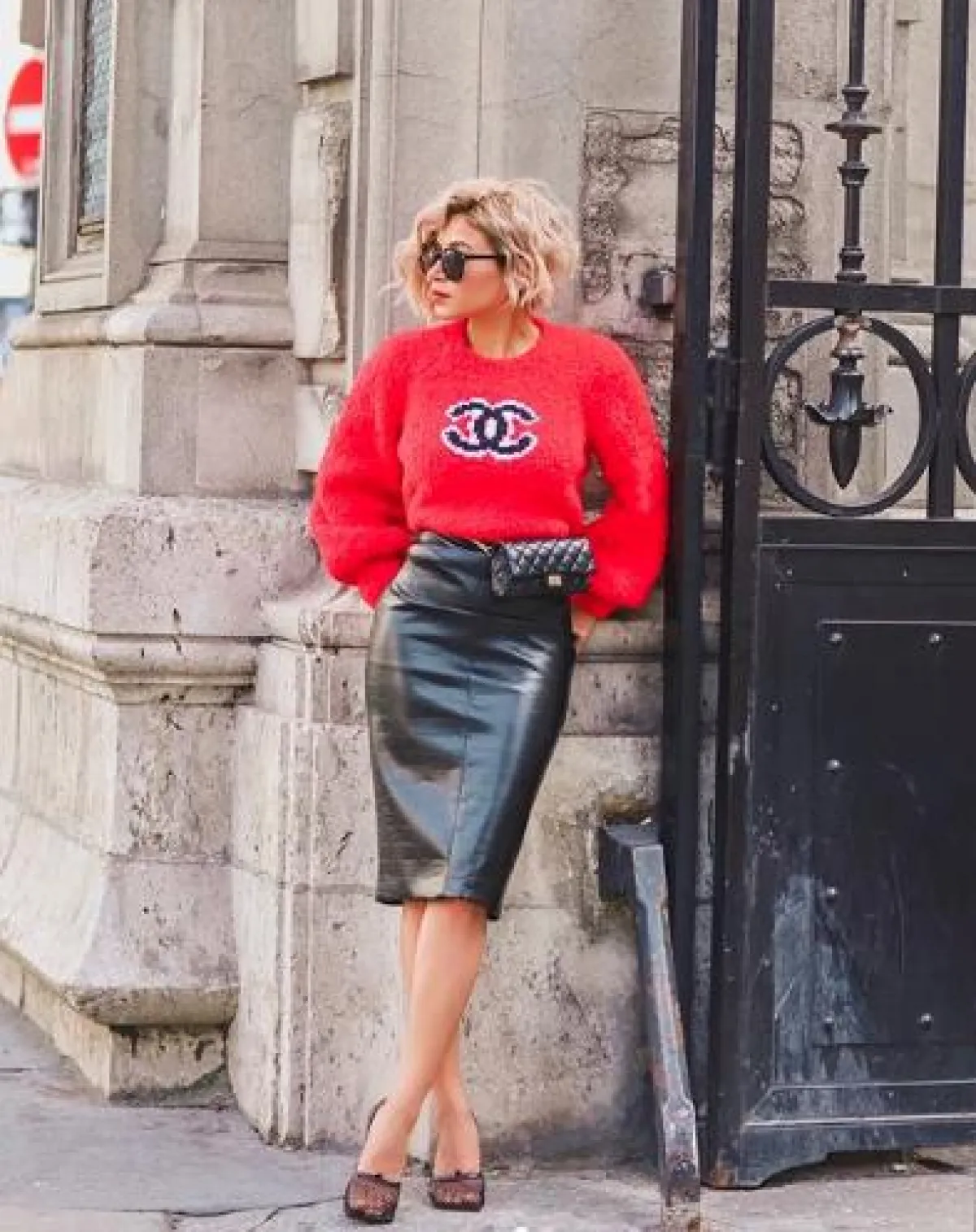 التنورة الميدي توحي بالكثير من الأناقة والأنوثة، لا سيما وإن كانت مصنوعة من قماش مثل الجلد، كالتي اختارتها نهى نبيل في أحد المشاوير وقد نسقت معها سويتر من الصوف باللون الأحمر من شانيل Chanel وزينت خصرها بحقيبة صغيرة من الجلد أيضًا، واختارت مع اللوك حذاءً عصريًّا من الشبك الأسود من بوتيغا فينيتا Bottega Veneta.
