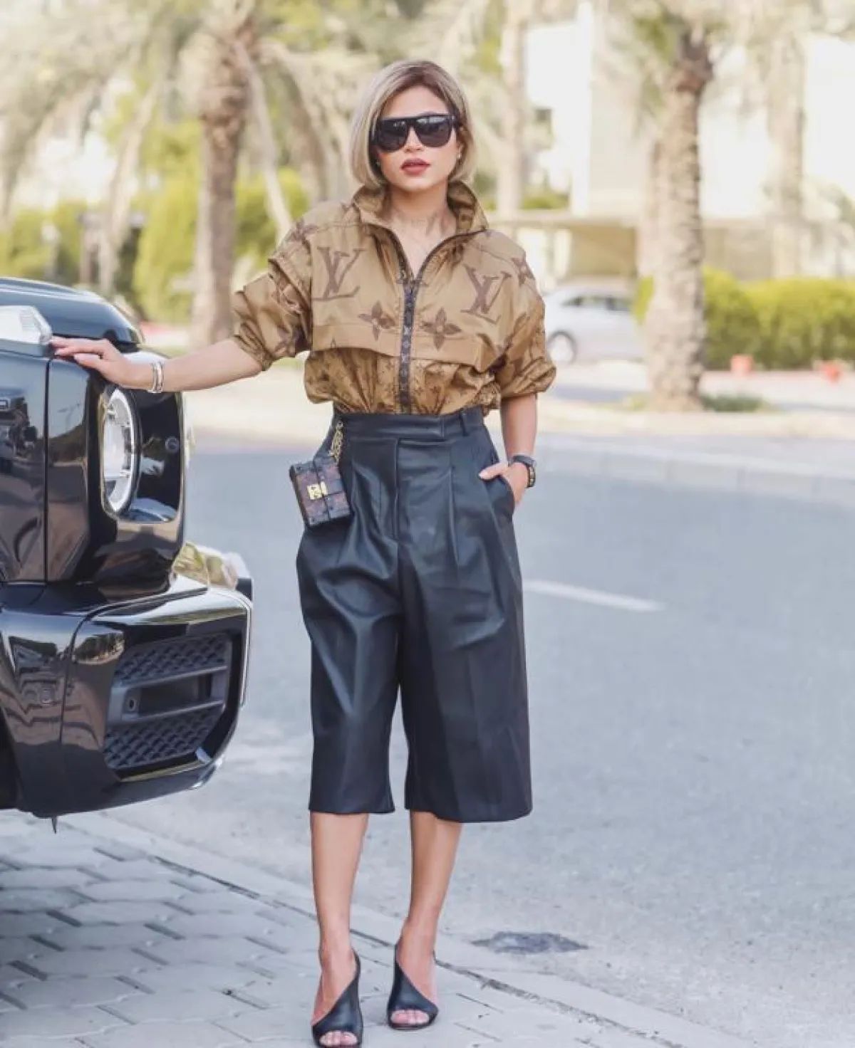 فساتين الجلد رائجة جدًّا هذا الموسم، وهي مثالية للزيارات المسائية أو لاطلالات الدوام، وقد شاهدنا نهى نبيل في اطلالة أنيقة اختارت فيها فستان ميدي من الجلد باللون العسلي، زينت خصره بحزام باللون البني، واختارت معه حذاءً بكعب عالٍ باللون البيج، وشنطة يد أنيقة من لويس فويتون Louis Vuitton.