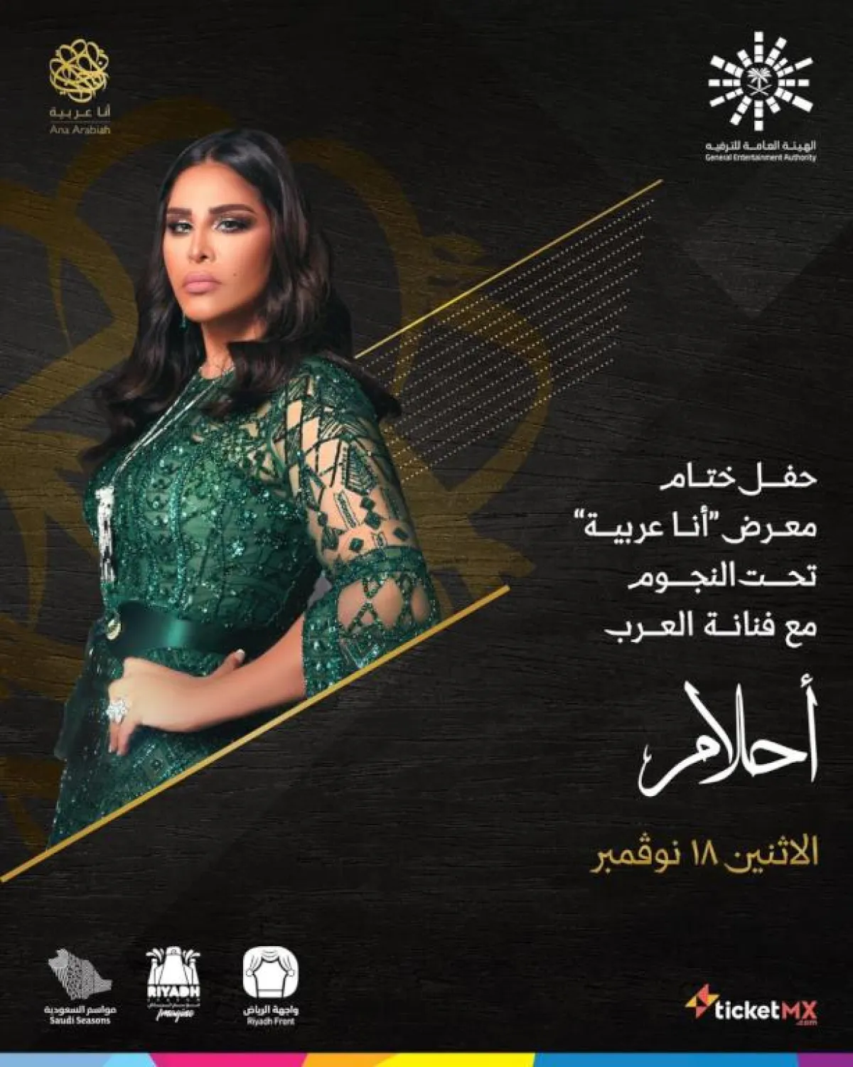 تحيي الفنانة أحلام، الاثنين المقبل، الحفل الختامي لمعرض "أنا عربية"، الذي يُعنى بمجال الأزياء والتصاميم والابتكار، ويُنظَّم ضمن فعاليات موسم الرياض.