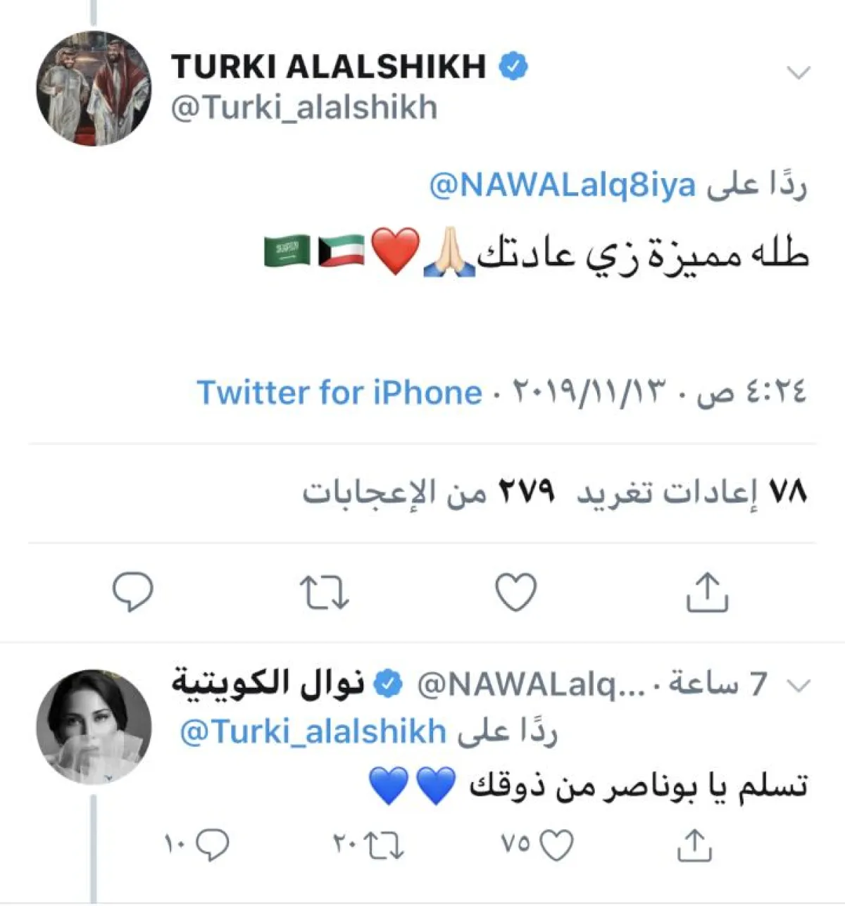 من جهته، ردَّ تركي آل الشيخ على تغريدة نوال، مثنياً على إطلالتها، كاتباً: "طلة مميزة زي عادتك".
