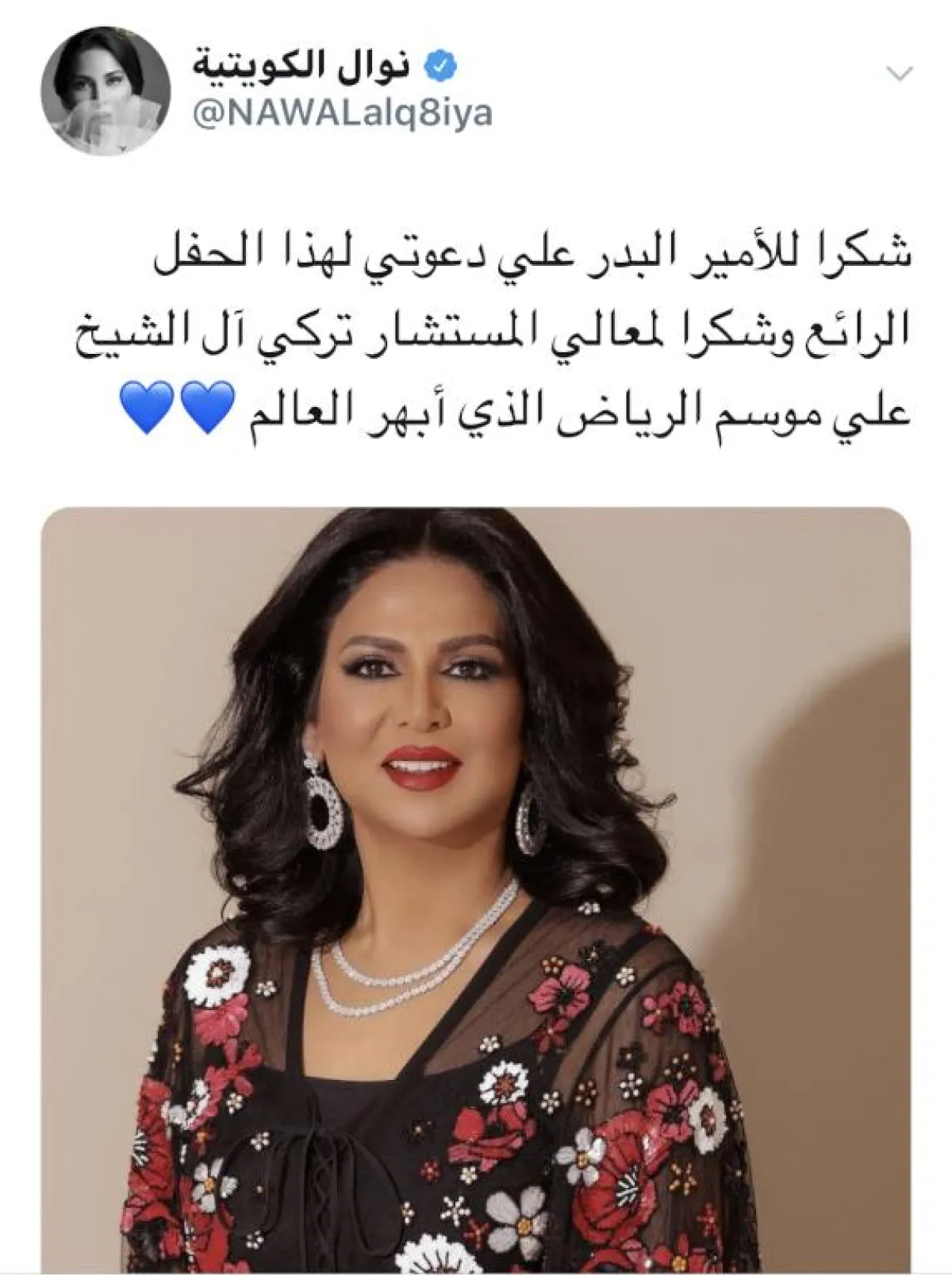 حيث نشرت نوال تغريدةً في حسابها الرسمي بـ "تويتر"، قالت فيها: "شكراً للأمير البدر على دعوتي لهذا الحفل الرائع، وشكراً لمعالي المستشار تركي آل الشيخ على موسم الرياض الذي أبهر العالم".