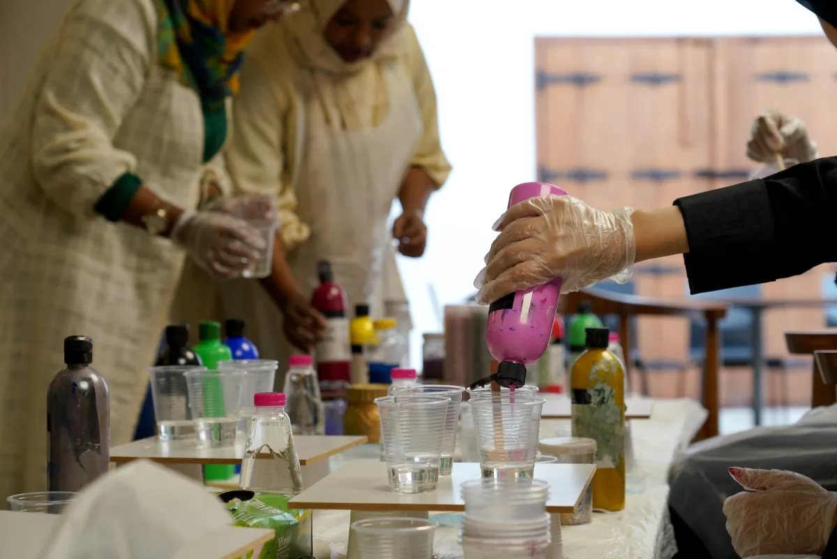 وشرحت المدربة بوادر بشير للزوار خلال الورشة أساسيات الرسم بمادة "الريزن"، وطريقة مزجها بالألوان، مقدمةً لهم نصائح حول أهمية قياس المقادير بشكل دقيق، وكذلك كيفية استخدام المادة في الطلاء، وطرق استخدامها لصب القوالب وتغليف المواد الطبيعية والصناعية كالصدف وقطع الكريستال، وغيرها.