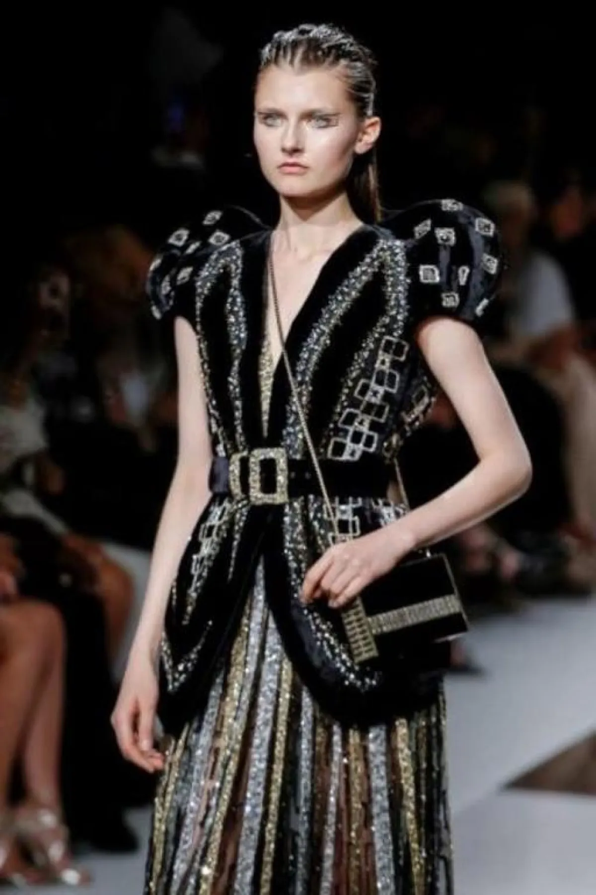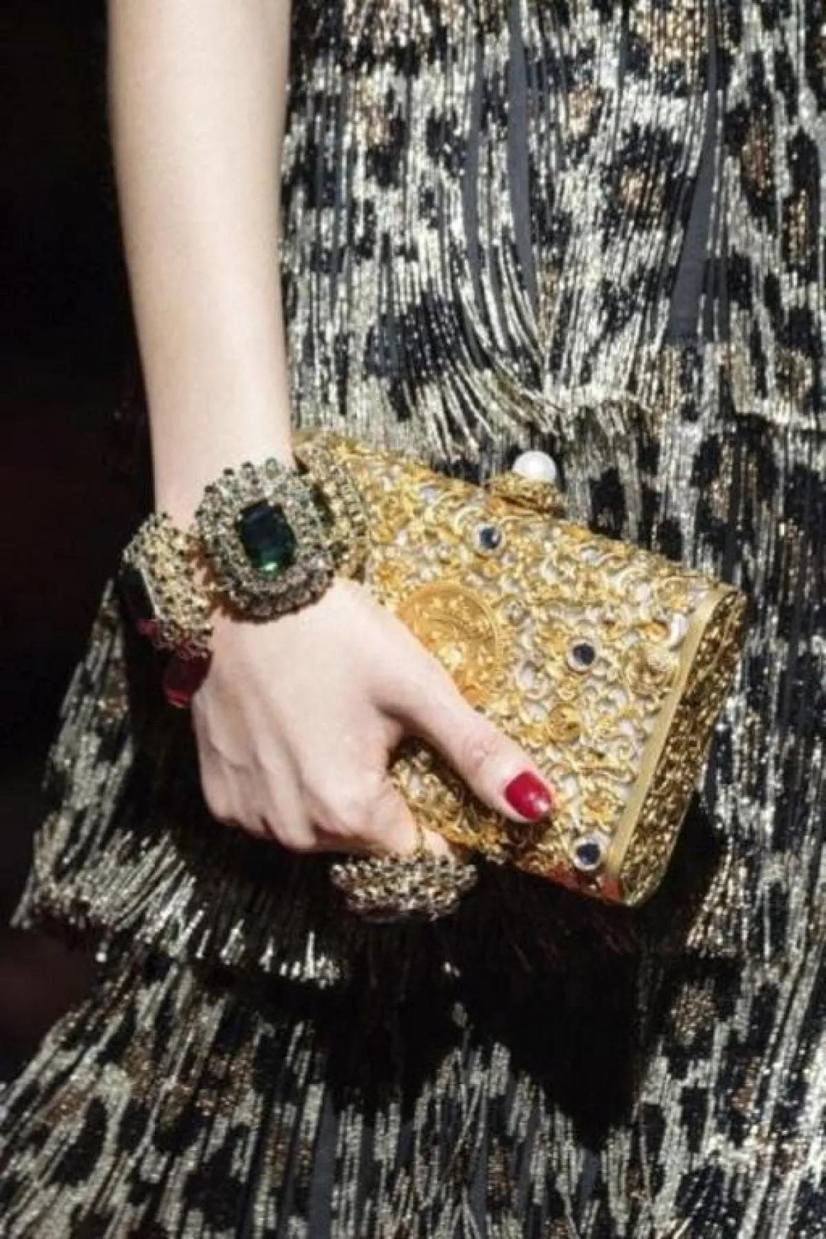عند الحديث عن الشنط المرصعة بالتطريز لا بد أن نذكر إبداعات دار دولتشي آند غابانا Dolce & Gabbana التي لا تنضب وقدمت هذا الموسم حقيبة ذهبية مزدانة باللؤلؤ الأبيض وتناسب فستان طويل بطبعات رقيقة.