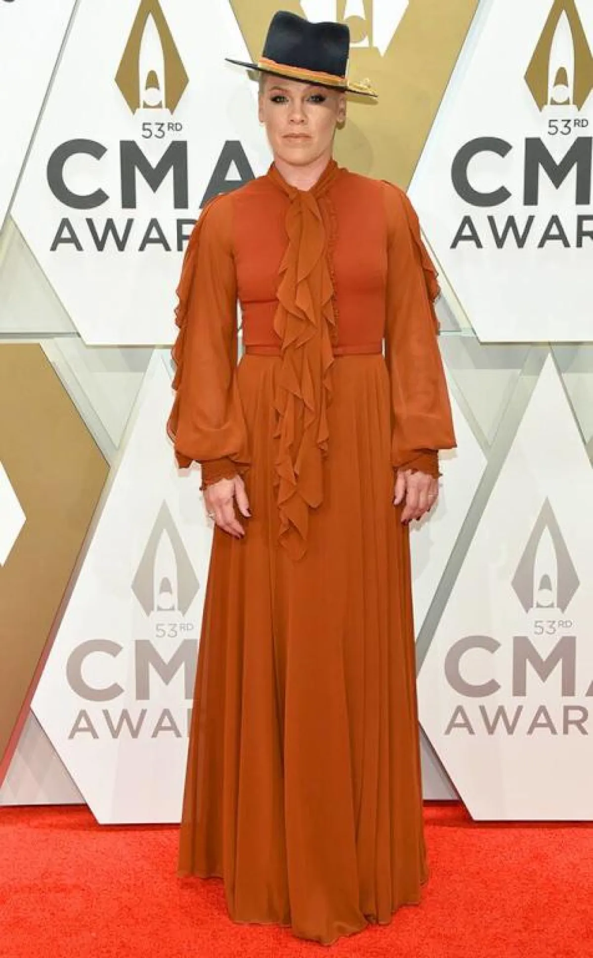 كيري أندروود Carrie Underwood تُعتبر إحدى أشهر نجمات موسيقي الكاونتري في عصرنا الحالي وفي كل عام، في حفل الـ CMA نراها في اطلالة مميزة، وهذا العام كان خيارها موفقًا لكن فيه بعض الأخطاء، وقد اختارت فستانًا من قماش الشيفون المطرز بالترتر الذهبي من إيلي ماضي Elie Madi، قصة الفستان جميلة لكنّ البطانة من تحته ولا سيما من الجزء السفلي، بدت بارزة بشكل غير أنيق، وكذلك الذيل المصنوع من التول الرمادي لم يكن له ضرورة.