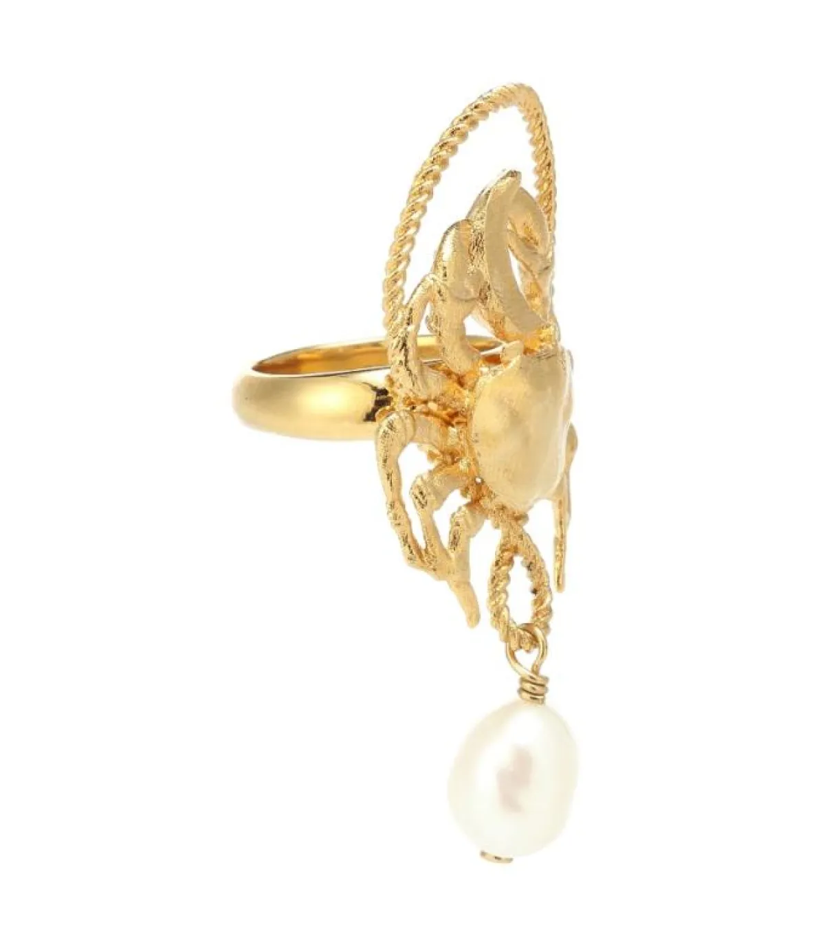 تميز هذا الخاتم باستخدام كثير للذهب الأصفر فيه بشكل متنوع، سواء كان الذهب بتصميم مبروم أو ثابت، لكن ما ميّزه حقاً هو حبة اللؤلؤ الأنيقة التي تتدلى منه لتمنحك فخامة وجاذبية.