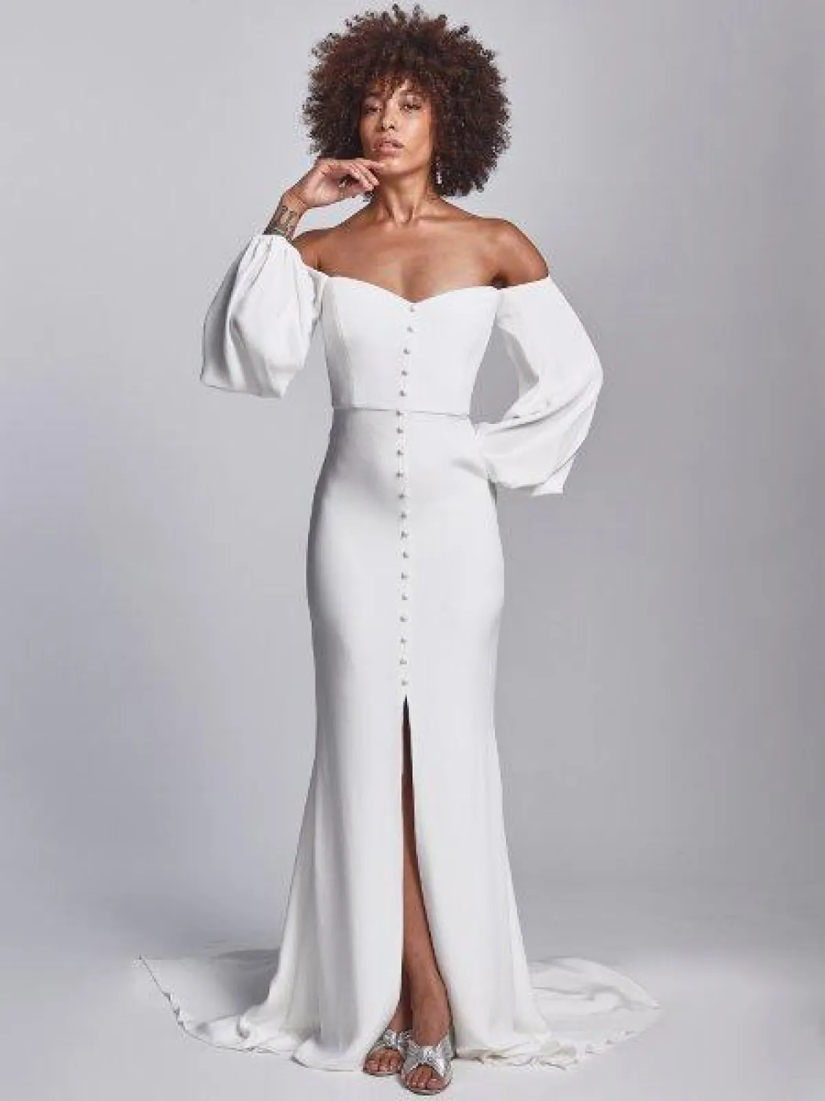 قدمت ماركة Alexandra Grecco فستان زفاف ناعم بقصّة أوف شولدر وشق أمامي طويل، ومزين بأزرار من الأمام.