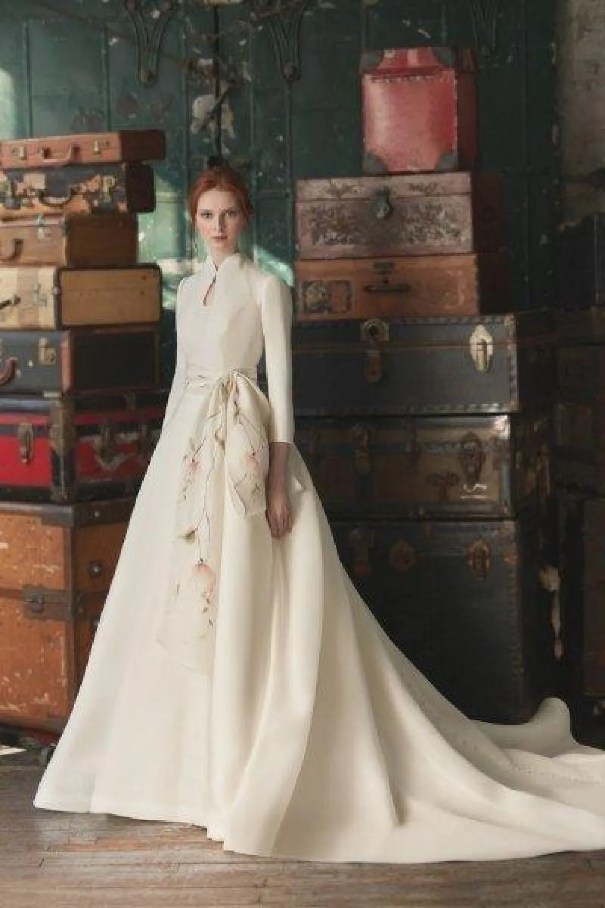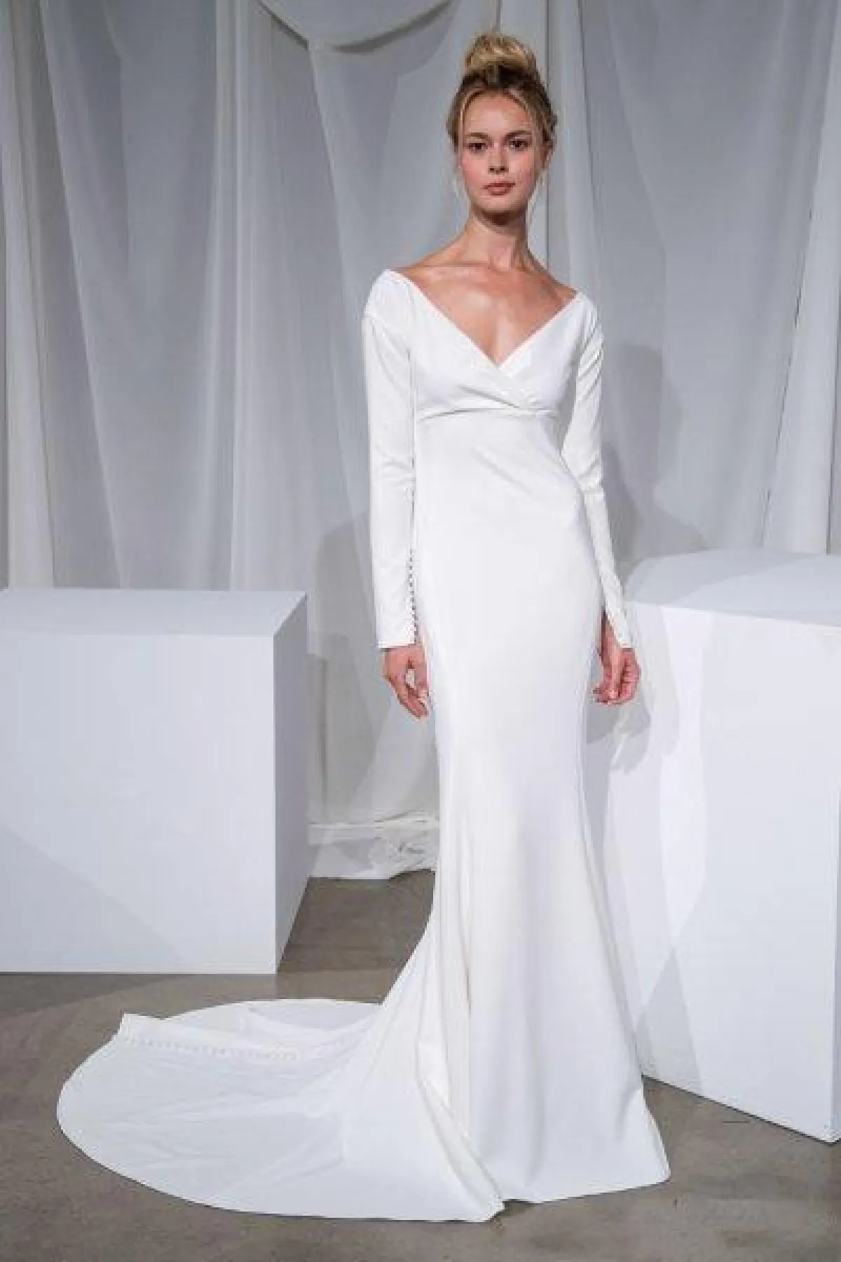 أيضاً قدمت ماركة Amsale فستان زفاف ناعم بقبّة V وأكمام طويلة وتصميم عمودي مع ذيل ينسدل على الأرض.
