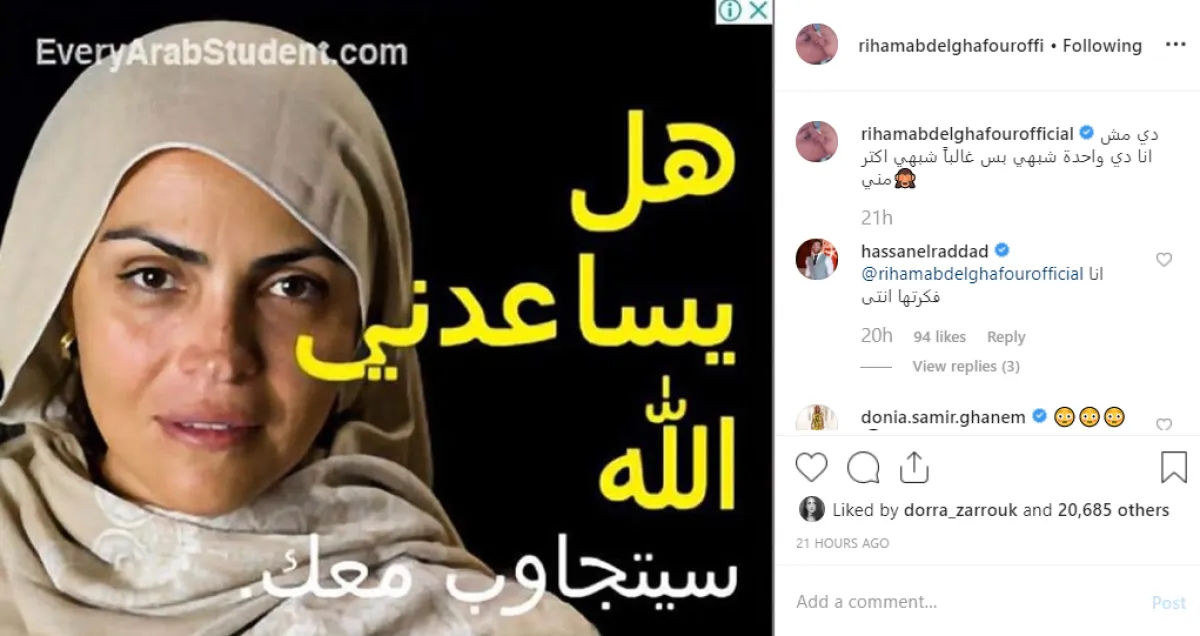ريهام تلقت المئات من الاستفسارات حول حقيقة مشاركتها في الحملة خاصة وأن البوسترات تحمل صورتها بغطاء الراس، والمفاجأة أن الفنان حسن الرداد والنجمة دنيا سمير غانم صدقا أن زميلتهما ريهام تشارك في الحملة بالفعل، ولهذا بادرت الأخيرة بنشر الصورة المتداولة عبر حسابها بموقع إنستقرام وعلقت عليها قائلة: دي مش انا دي واحدة شبهي بس غالباً شبهي اكتر مني.