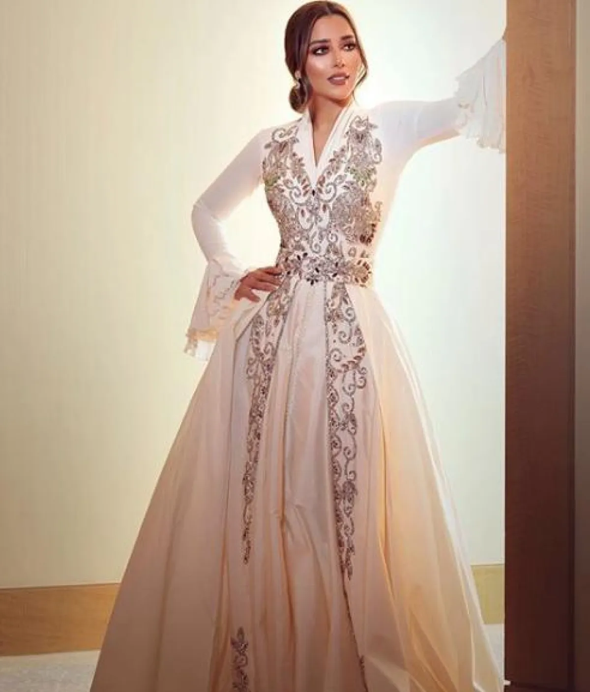 تعتمد بلقيس فتحي في الكثير من الأحيان اطلالات شرقية في القفاطين الفاخرة، مثل هذه الاطلالة التي تألقت بها في إحدى المناسبات، واختارت فيها قفطانًا مميزًا باللون الأبيض من زينة زكي Zeena Zaki مطرزًا باللون، الفضي وقصته أنثوية محددة الخصر وأكمامه طويلة تنتهي بالدانتيل.