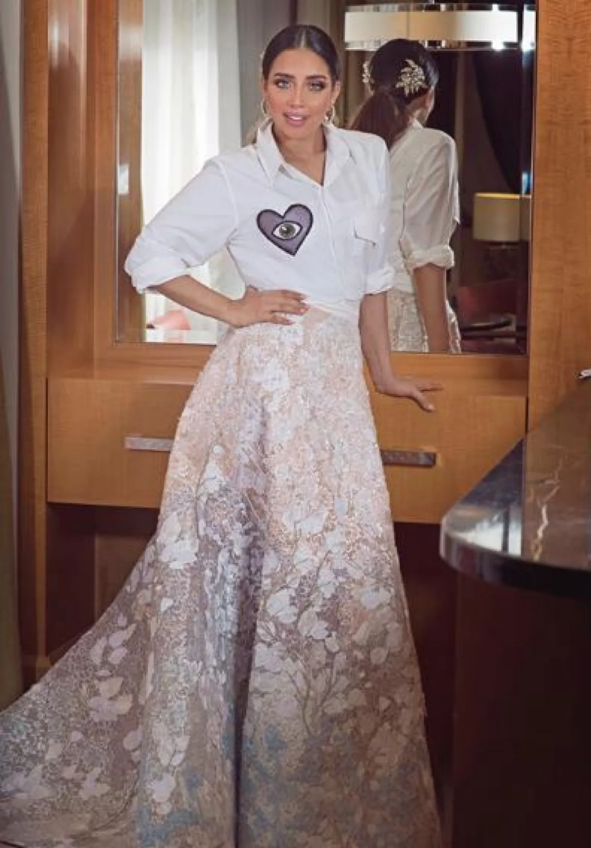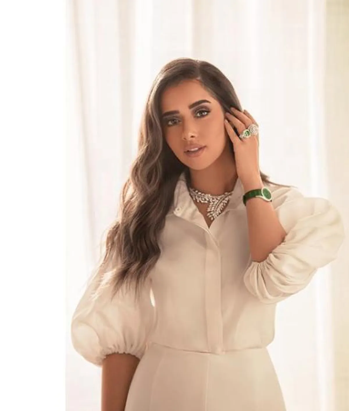 كما ذكرنا فإنّ اللون الأبيض يلائم بلقيس فتحي كثيرًا ولا سيما حين تنسقه بأسلوب ناعم مثل هذه الاطلالة، التي اختارت فيها قميصًا باللون الأبيض أكمامه متوسطة الطول ومنفوخة، وهذا النوع من الأكمام رائج جدًّا هذا الموسم، وقد نسقت معه تنورة بخصر عالٍ بيضاء أيضًا، وزينت الاطلالة بمجوهرات ماسية فاخرة باللونين الماسي والأخضر.