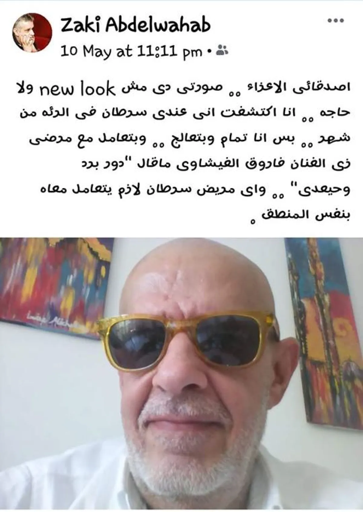 زكي ابن المطربة الراحلة ليلى مراد من المخرج الراحل فطين عبد الوهاب، والزوج السابق للنجمة الراحلة سعاد حسني، نشر صورة له بعدما حلق شعر راسه بالكامل وعلق عليها عبر حسابه الرسمي بموقع الفيس بوك قائلا: أصدقائي الأعزاء دي صورتي، دي مش نيولوك ولا حاجة، أنا اكتشفت إني عندي سرطان بالرئة من شهر بس، أنا تمام وبتعالج.