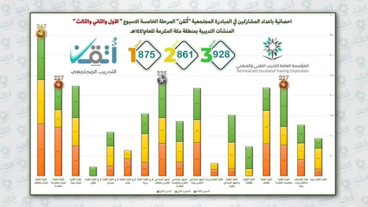 أنهت منشآت التدريب التقني والمهني بمنطقة مكة المكرمة تأهيل ( 2664 ) مواطن ومواطنة بنهاية الأسبوع الثالث من برنامج التدريب المجتمعي "أُتقن 5 ".