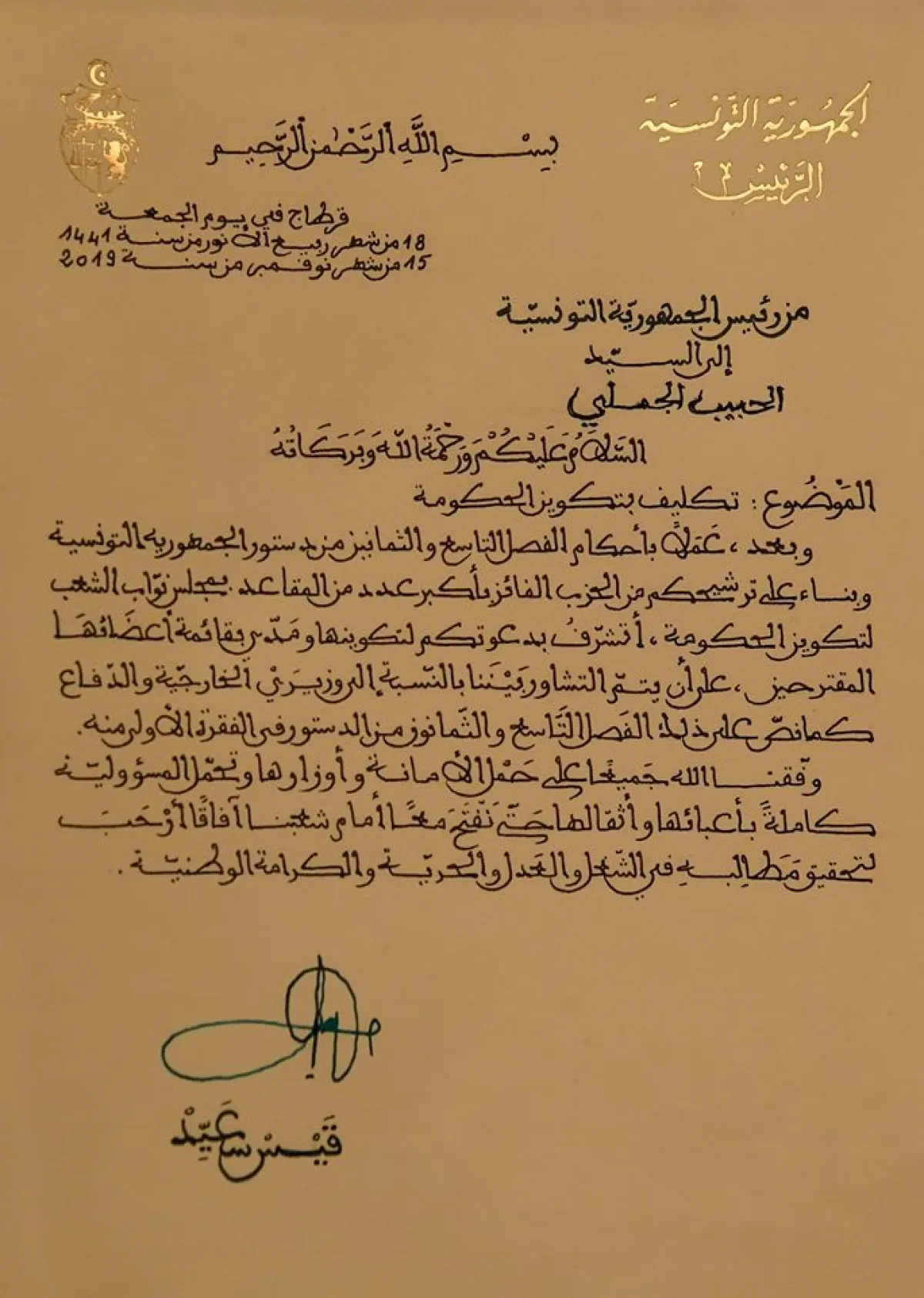 سلم الرئيس التونسي قيس سعيد المرشح لمنصب رئيس الحكومة الحبيب الجملي رسالة تكليف لتشكيل الحكومة الجديدة وفق ما ينص عليه الدستور التونسي.