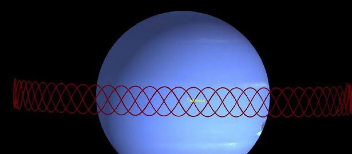 في هذا الرقص الكوني، يدور «نياد» حول نبتون كل سبع ساعات، بينما يأخذ «ثالاسا» المسار الخارجي، ويستغرق 7.5 ساعات حتى يدور حول الكوكب.. ويتبع مدار «نياد» نمطاً متعرجاً غريباً، لم تره ناسا من قبل.