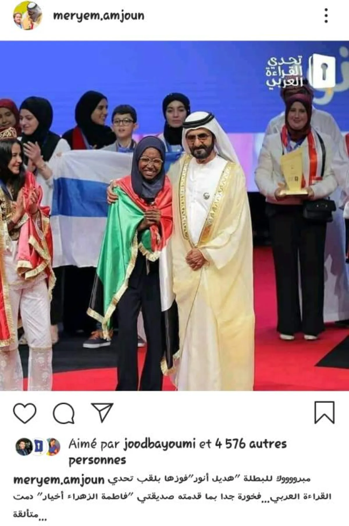 باركت الطفلة المغربية مريم أمجون، للتلميذة السودانية هديل أنور الفوز بلقب تحدي القراء العربي لعام 2019، حيث نشرت أمجون الفائزة بنفس اللقب عام 2018، على حسابها الرسمي على إنستغرام صورة من حفل تتويج هديل، أرفقته بتعليق جاء فيه: " مبروك للبطلة هديل أنور فوزها بلقب تحدي القراءة العربي ".