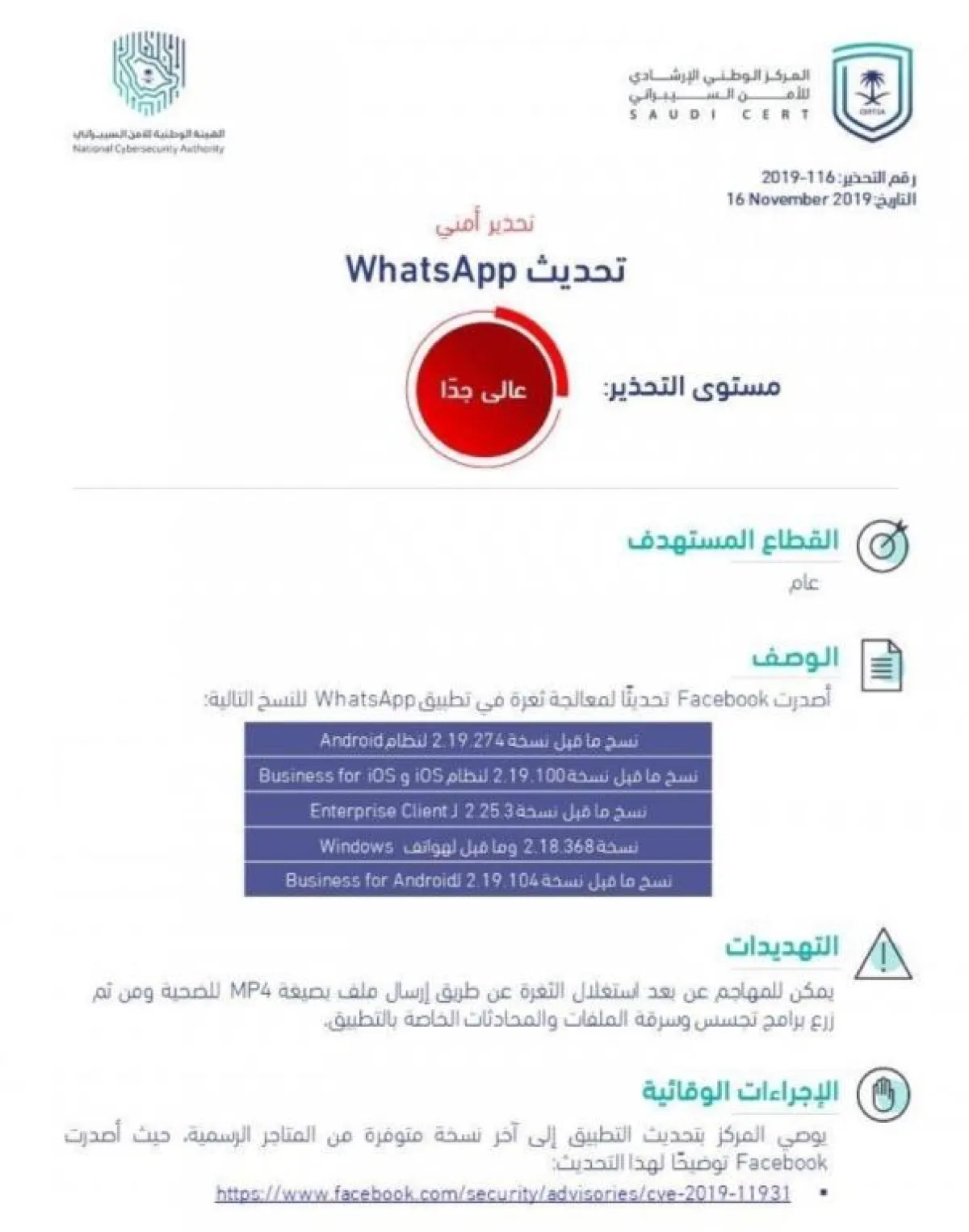 وفي التفاصيل، فقد وجه المركز الوطني الإرشادي للأمن السيبراني، تحذيراً أمنياً عالي المستوى بخصوص تحديث لمعالجة ثغرة في تطبيق "واتس آب" الأكثر شهرة واستخداماً حول العالم.