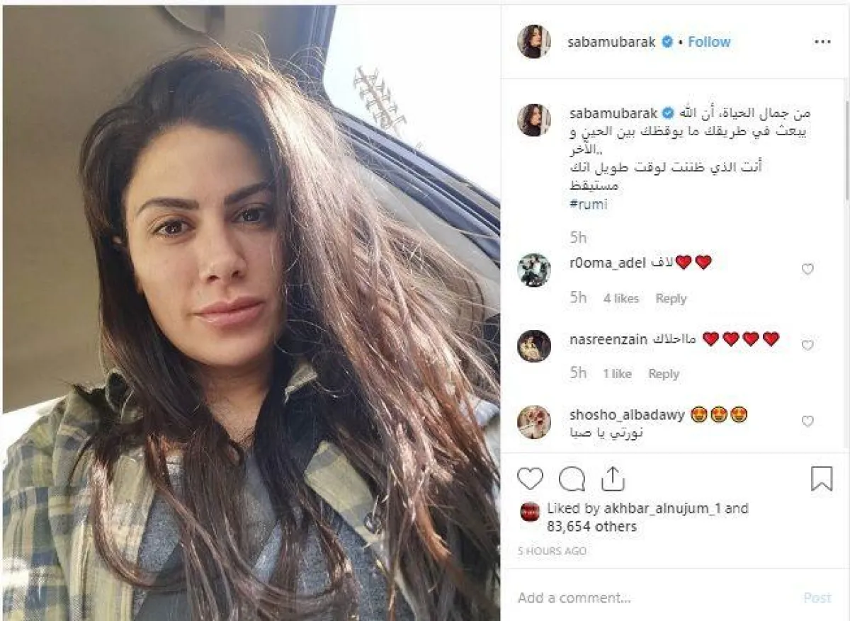 وحظيت الصورة التي نشرتها صبا مبارك، بردود فعل واسعة من الجمهور، وبدت الصورة طبيعية التقطتها صبا على طريقة "السيلفي"، وظهرت بها من دون مكياج لتشفي تساؤلات الكثيرين الذين ينتظرون عودتها الفنية، واطلالاتها المعتادة عبر مواقع السوشيال ميديا الخاصة بها.