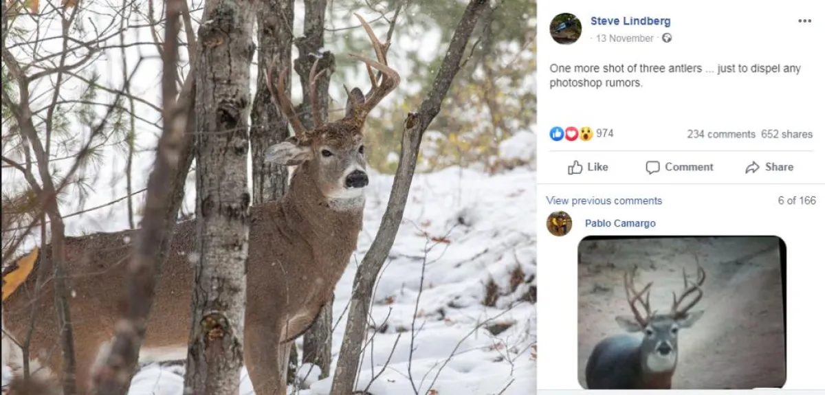 ووفقاً للصورة التي نشرها ستيف ليندبرغ، فقد ظهر الغزال بقرنين طبيعيين، وكان هنالك قرن ثالث بارز من وسط جبهته. وبعد انتشار العديد من الشائعات بأن الصورة مزيفة. قال الممثل السابق لولاية ميشيغان، إن الصورة حقيقية وليست فوتوشوب على الإطلاق. مشيراً إلى أن فصيلة الأيائل بيضاء الذيل، من المعروف أنها تعيش في أماكن مختلفة من الولاية الأميركية.