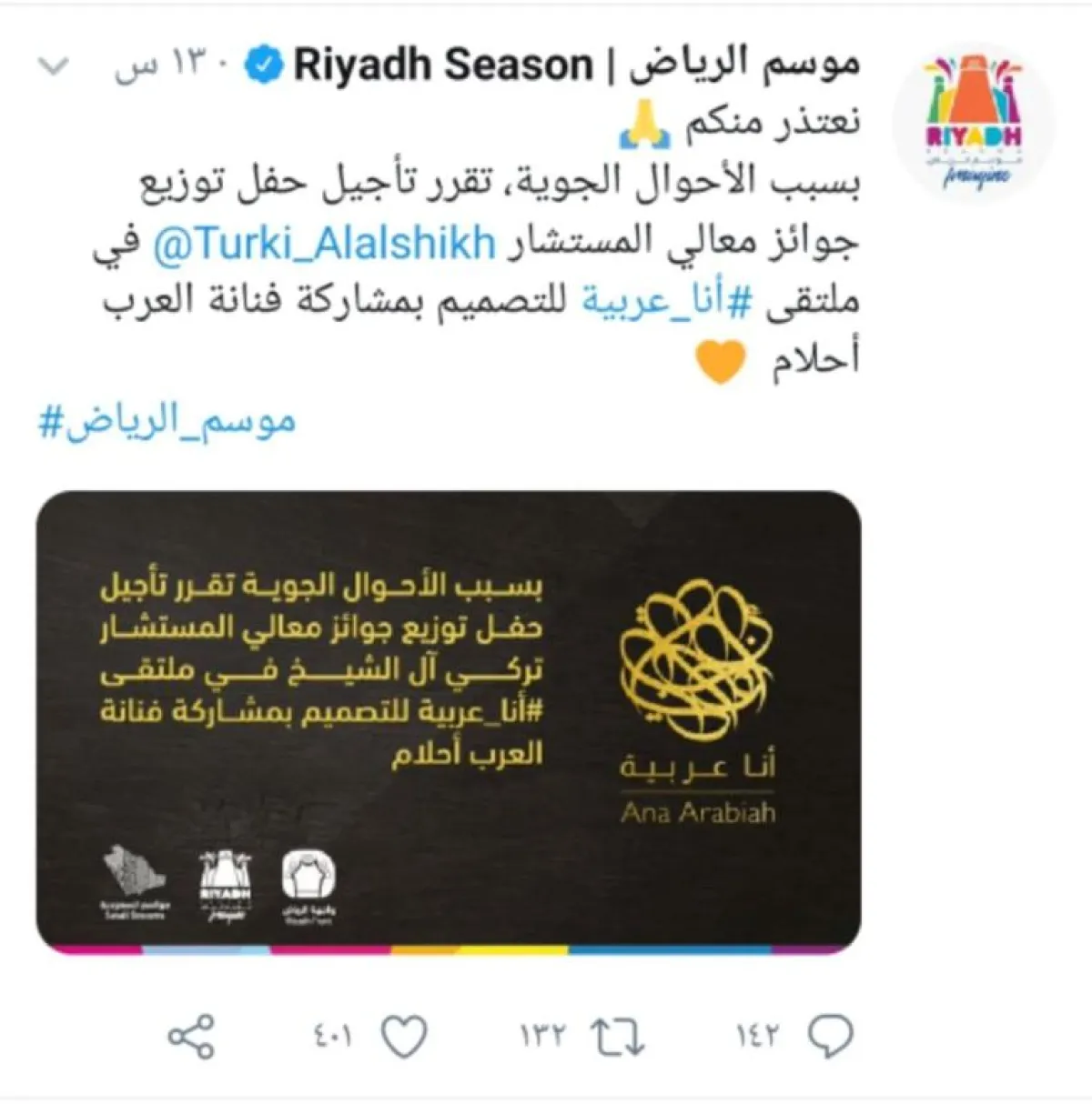 حيث نشرت صفحة موسم الرياض تغريدة عبر حسابها الرسمي في "تويتر"، قالت فيها: "نعتذر منكم.. بسبب سوء الأحوال الجوية.. تقرَّر تأجيل حفل توزيع جوائز المستشار تركي آل الشيخ في ملتقى أنا عربية للتصميم بمشاركة فنانة العرب أحلام".