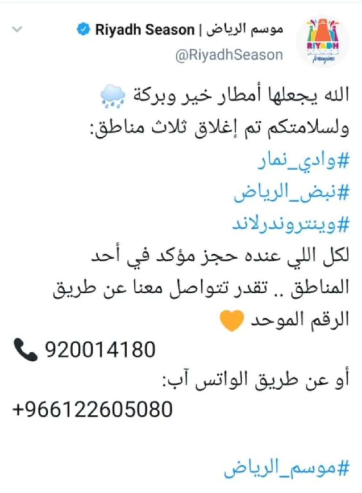 وكان من المقرَّر أن يقام الحفل أمس الاثنين 18 نوفمبر، لكن بسبب سوء الأحوال الجوية تقرَّر تأجيله، كما كشفت إدارة الموسم عن إغلاق ثلاث مناطق تحتضن فعالياته، هي: وادي النمار، ونبض الرياض، وونتر وندرلاند لذات السبب.