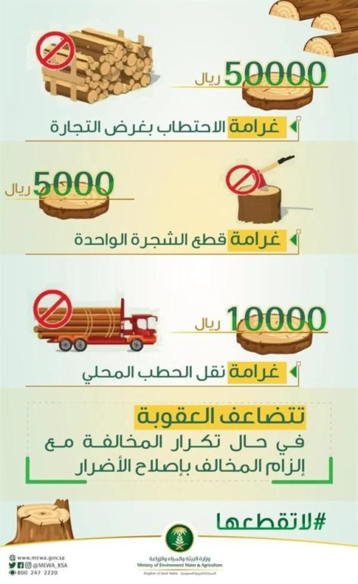 توعدت وزارة البيئة والمياه والزراعة كل من يقدم على قطع الأشجار، مؤكدة أن عقوبتها غرامة مالية تصل إلى 50 ألف ريال.