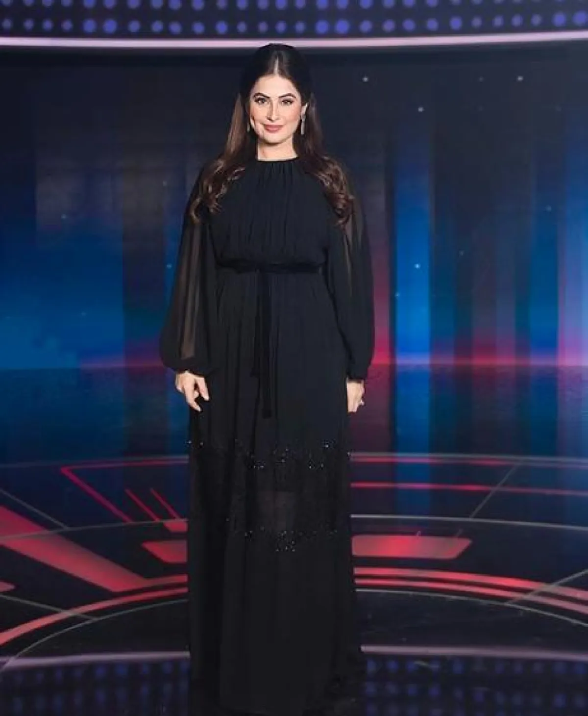 على المسرح شاهدنا رؤى الصبان في اطلالة مميزة ومفعمة بالأنوثة، اختارت فيها فستانًا أسود بكمّ طويل، مصنوعًا من قماش الموسلين المنسدلة، مزينًا بحزام من المخمل الأسود على الخصر، وبعض حبات الترتر البراقة على التنورة التي أضفت عليه لمسات من الفخامة، وقد اختارت مع الاطلالة أقراطًا ناعمة.