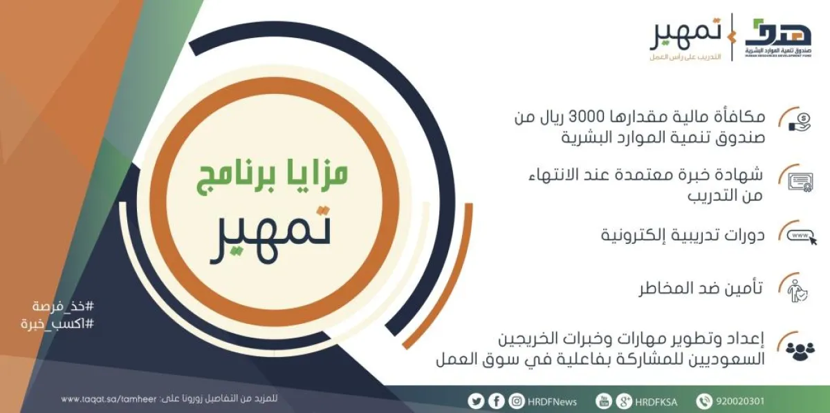 إلى ذلك جدد "هدف" دعوته للخريجين والخريجات للاستفادة من الفرص التدريبية لبرنامج "تمهير"، واكتساب الخبرات والمهارات اللازمة المطلوبة لسوق العمل من خلال التدريب العملي في مواقع العمل الفعلية وفقًا لتخصصاتهم.