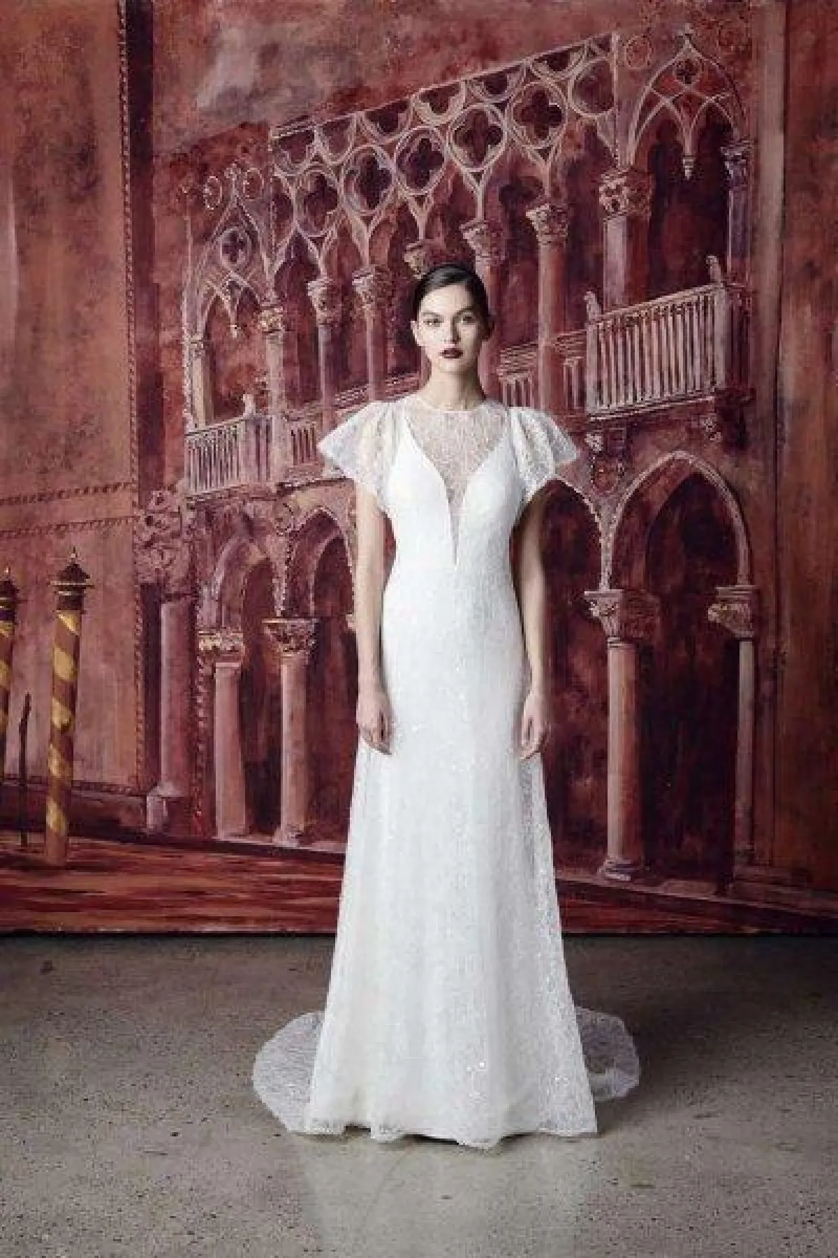 لا يشترط أن يكون فستان زفاف بأكمام قصيرة وواسعة، بل يمكن أن تكون طويلة أيضاً لإطلالة عصرية محتشمة، مثل فساتين زفاف Isabelle Armstrong، وتاداشي شوجي Tadashi Shoji.