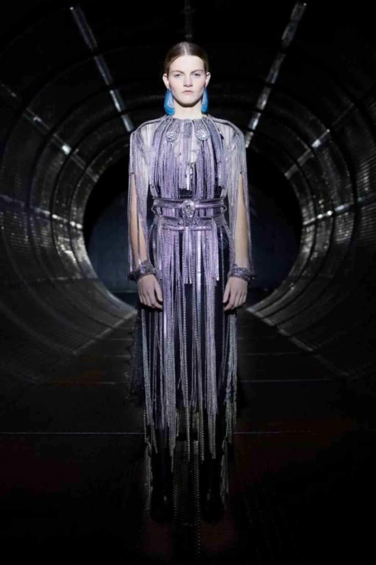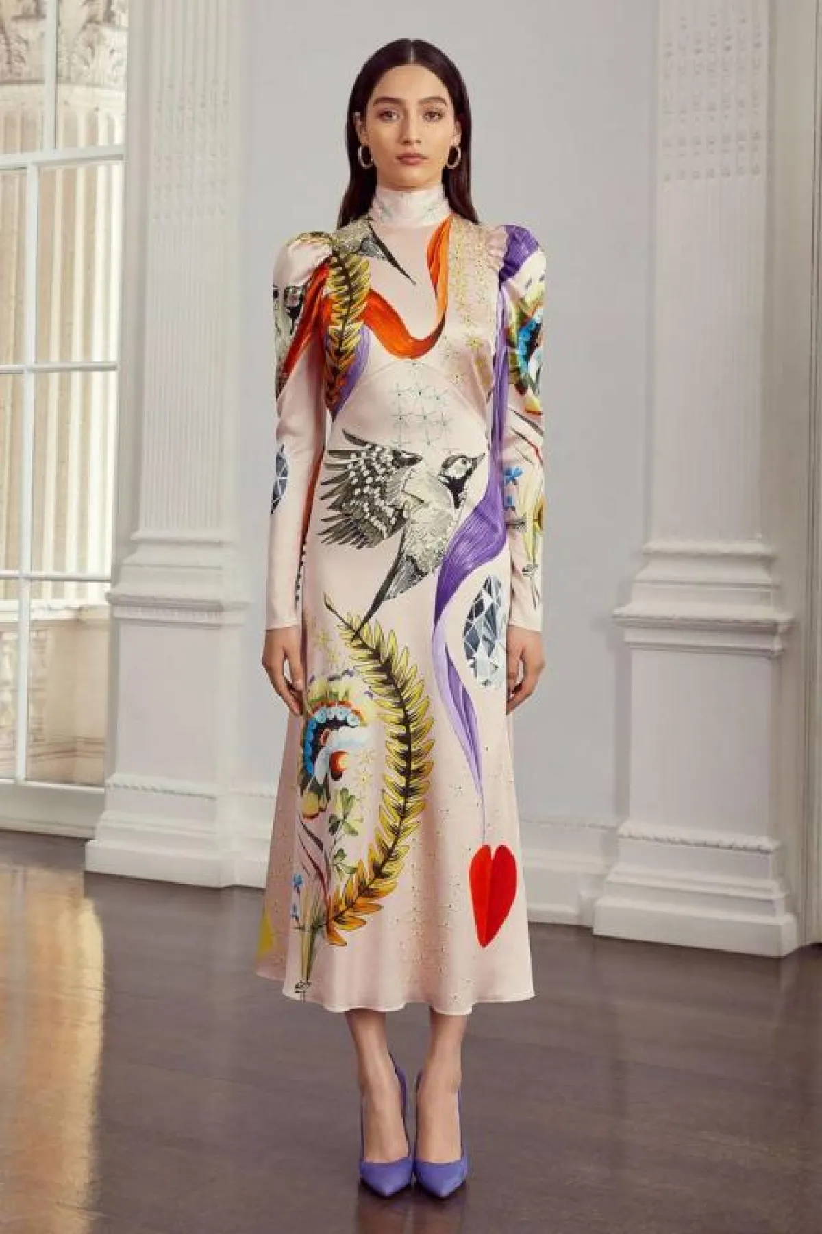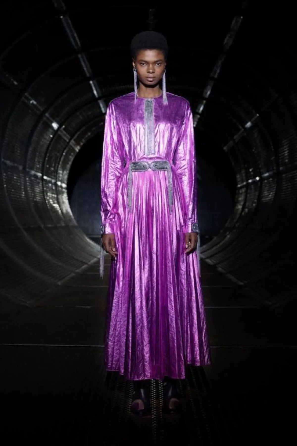 هذه الدرجة الأرجوانية المميزة للفستان من مجموعة Christopher Kane تناسبكِ إن كنتِ تبحثين عن اطلالة مستوحاة من أجواء التسعينيات، مع تطريزات فضية مميزة، نسقي معها أقراطًا من التطريزات نفسها، وتوربان فضيًّا.