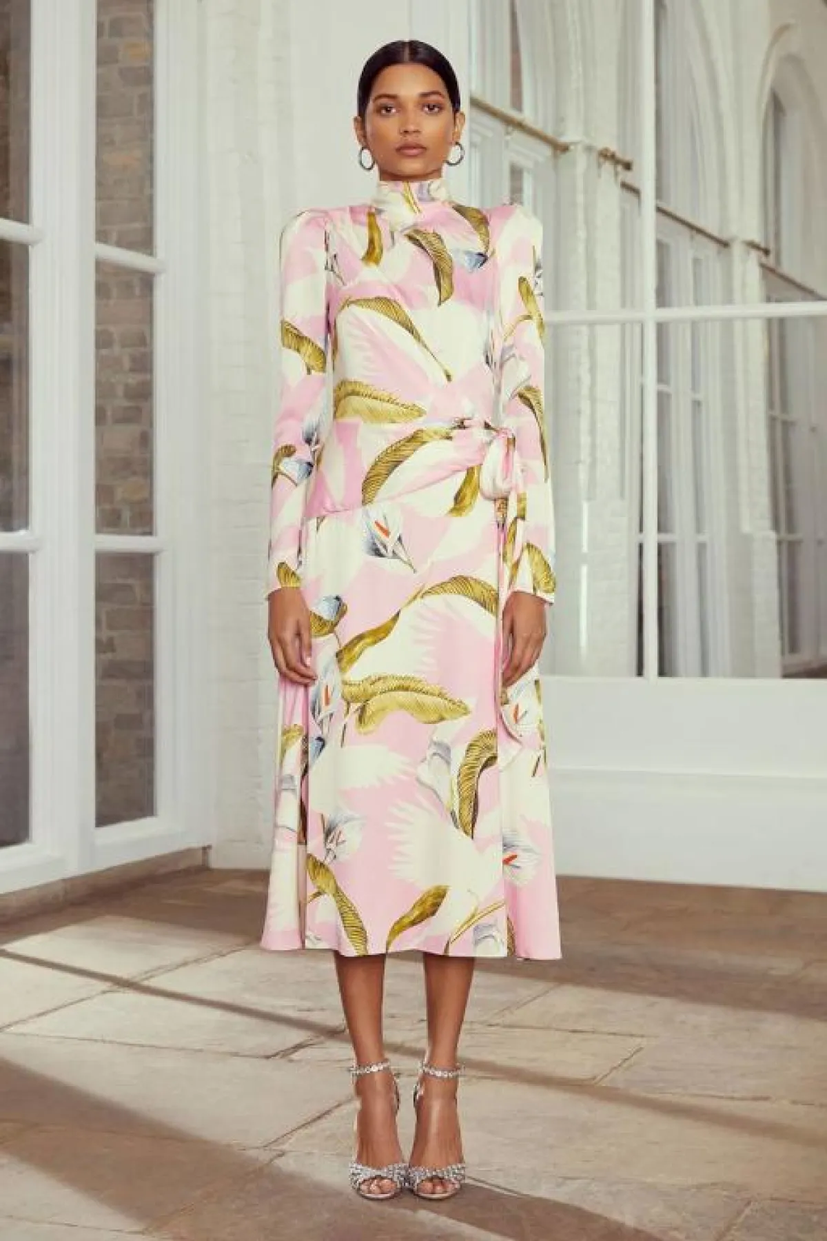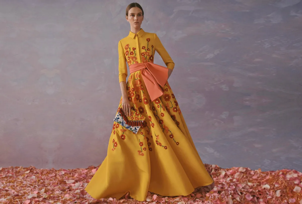 من التصميمات التي تناسب حفل الخطوبة بالمنزل هذا الموديل من Carolina Herrera، مع حزام الخصر العريض، وتطريزات الخيوط الوردية، مع لونه البسيط الذي يمنحكِ اطلالة كلها حيوية.