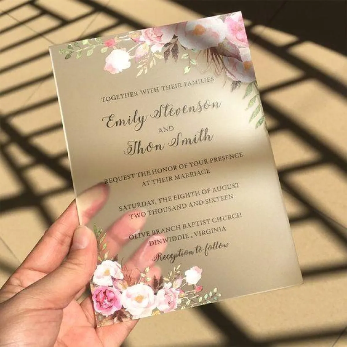 أو يمكنكِ اختيار بطاقة الدعوة على شكل لوح زجاجي ملون أو مطبع بالورود مثلًا، مع الكلمات المكتوبة لحفل الزفاف من الخطوط اللامعة لكي يظهر الخط بشكل واضح أكثر.